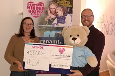 IKEA unterstützt die Arbeit der Deutschen Kinderhospiz Dienste in Dortmund mit einer Spende von 5000 Euro. Das Geld stammt von Mitarbeiter:innen des Logistikstandorts im Dortmunder Stadtteil Mengede, wo rund 1800 Beschäftigte bei IKEA Distribution Services tätig sind und für den europaweiten Versand von Artikeln sorgen. Birgit Müller, Sustainability Developer bei IKEA Distribution Services, überreichte den symbolischen Spendenscheck im Büro des Ambulanten Kinder- und Jugendhospizdienstes an der Dresdener Straße. Dort informierte sie sich bei Michael Cremann aus dem Fundraising-Team der Deutschen Kinderhospiz Dienste über die Bedeutung der ambulanten Kinderhospizarbeit und die wichtige Rolle von Spenden, die zur Finanzierung der Angebote beitragen.