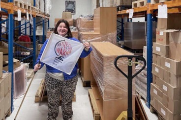 Das Bild zeigt Sally Jüssen von Grenzenlose Wärme mit den gespendeten Möbeln im Lager des Vereins.