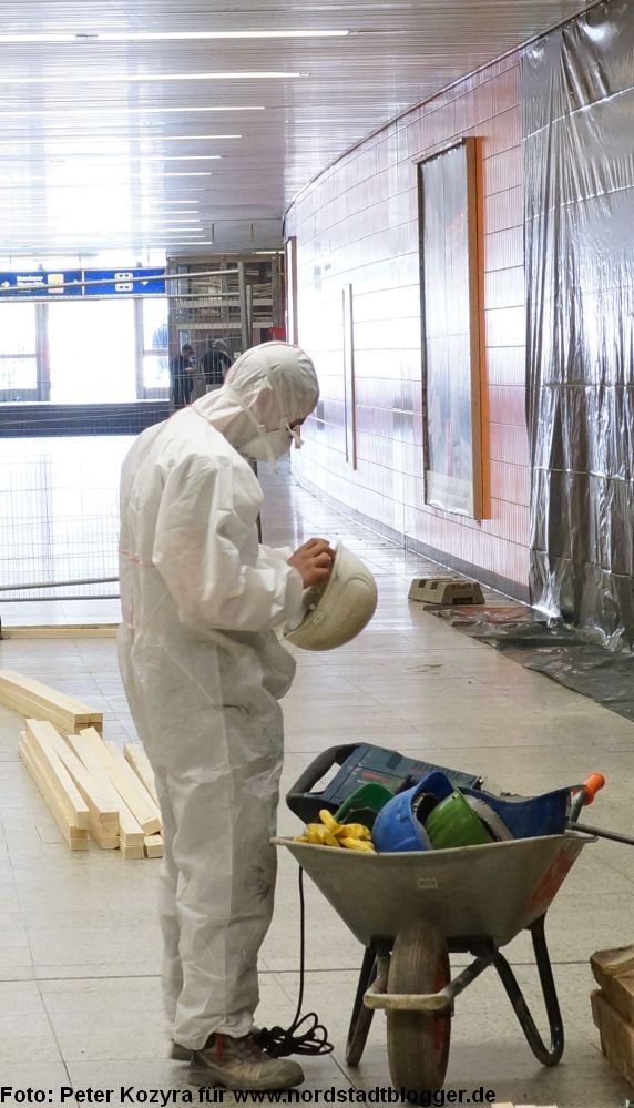 Der halbe Fußgängertunnel in einer grünen Folie, Männer im weißen Ganzkörperanzug, Atemschutzmaske und Bauhelm – Einen ungewöhnlichen Anblick erwartet in den kommenden Wochen und Monaten jeden, der sich in die Verteilerebene der Stadtbahnstation am Dortmunder Hauptbahnhof begibt.