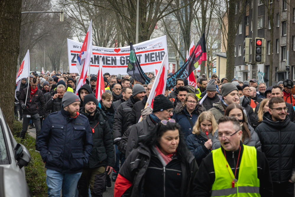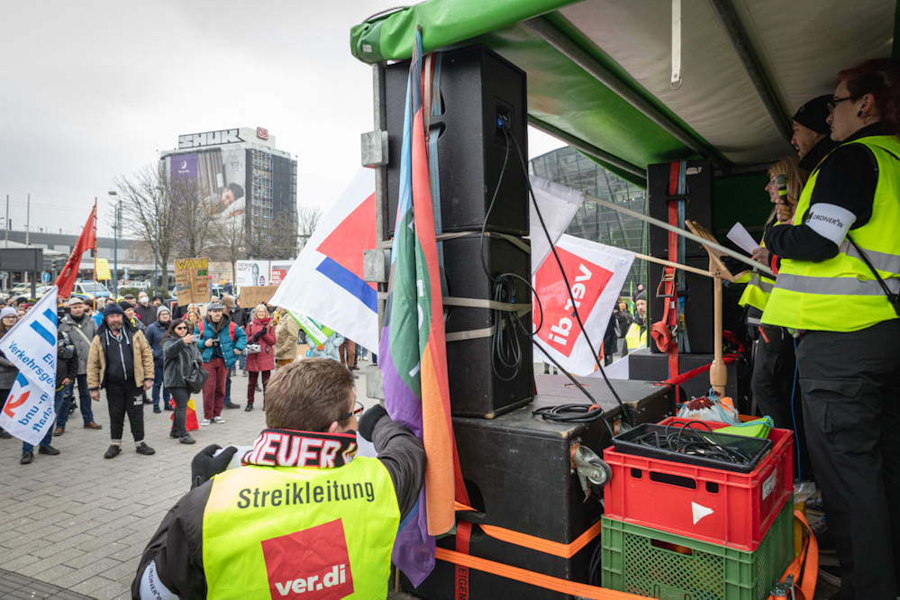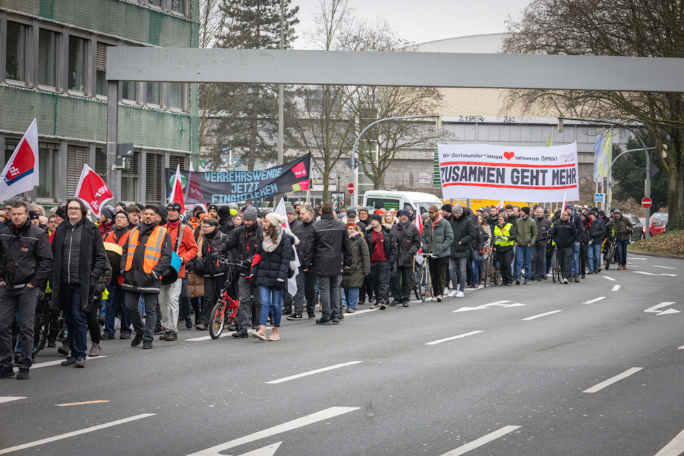 Der Warnstreik der Gewerkschaft ver.di sorgt am Freitagabend für massive Behinderungen im Umfeld von Westfalenhallen und Signal-Iduna-Park: Dort treffen am Freitagabend mehr als 100.000 Menschen aufeinander – und das ohne Nutzung von Bussen und Stadtbahnen. Bereits am Mittag gab es Verkehrsbehinderungen, als die Streikenden gemeinsam mit den Aktivist:innen von „Fridays For Future“ für mehr Klimaschutz und die Verkehrswende auf die Straße gingen.