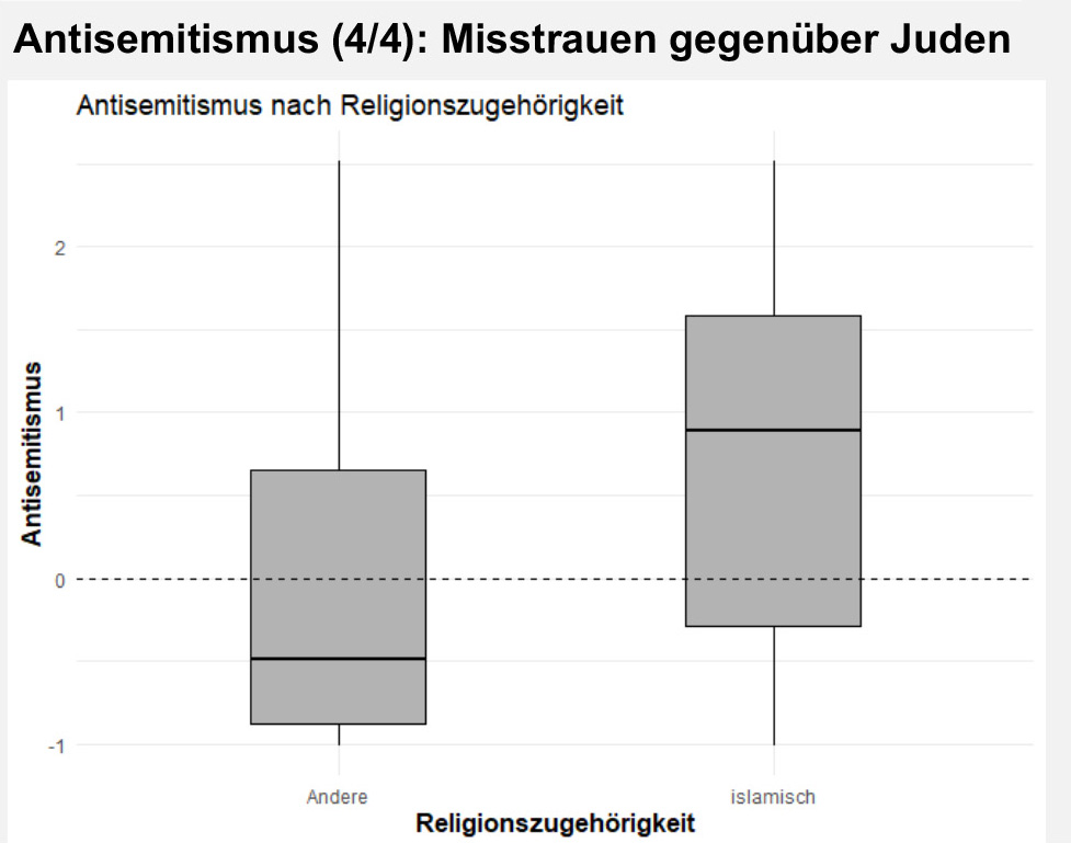 Die Auswertung nach Religionszugehörigkeit zeigt: Unter befragten Musliminnen liegen antisemitische Einstellungen deutlich höher als im Durchschnitt. Kurtenbach warnt gleichzeitig davor, daraus eine pauschale Abwertung von Musliminnen abzuleiten.