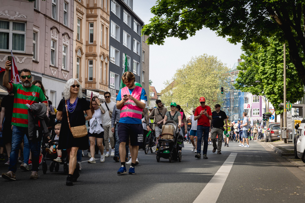 „Bei der Rüstung sind sie fix, für Soziales tun sie nix“, „Flüchtlinge bleiben, Nazis vertreiben“ und „Ganz Dortmund hasst die AfD“ skandierten die durch pinke Westen gekennzeichneten Teilnehmenden des „Jugendblocks“. Sie führten die Protestierenden vom Platz der alten Synagoge die Hohe Straße entlang, über die Saarlandstraße und die Ruhrallee hoch zum Westfalenpark.