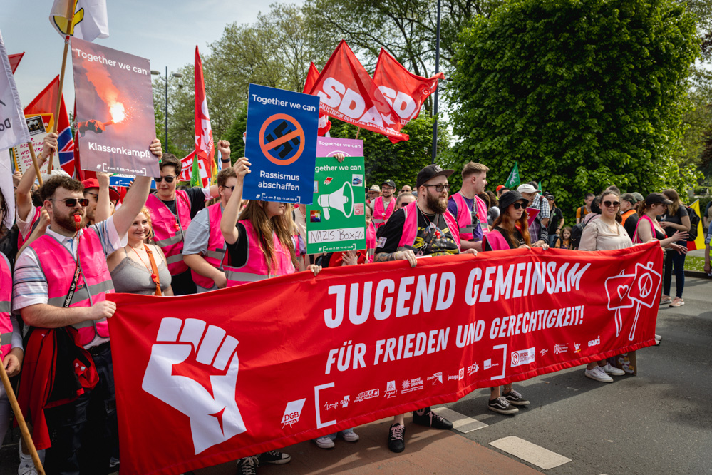 Um den Fachkräften von morgen eine lautere Stimme zu geben, führte in diesem Jahr der „Jugendblock“ der DGB den Demonstrationszug an. Inhalte, die die Jugendlichen und jungen Erwachsenen besonders interessierten, konnten so besser hervorgehoben werden. Dazu bastelten sie im Vorfeld eigene Schilder und Transparente.