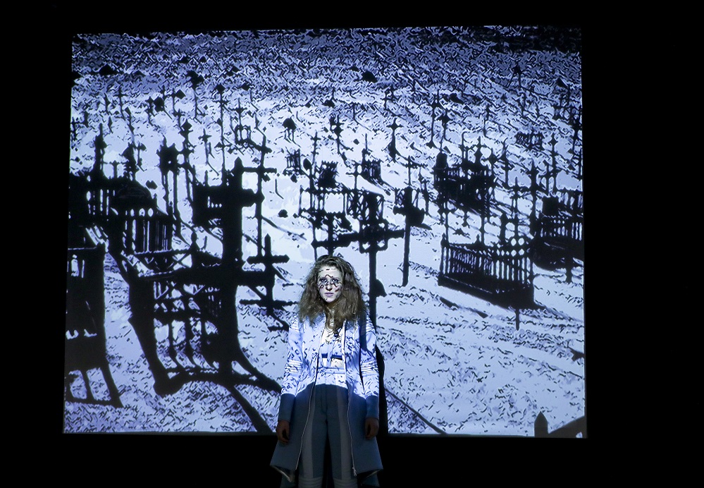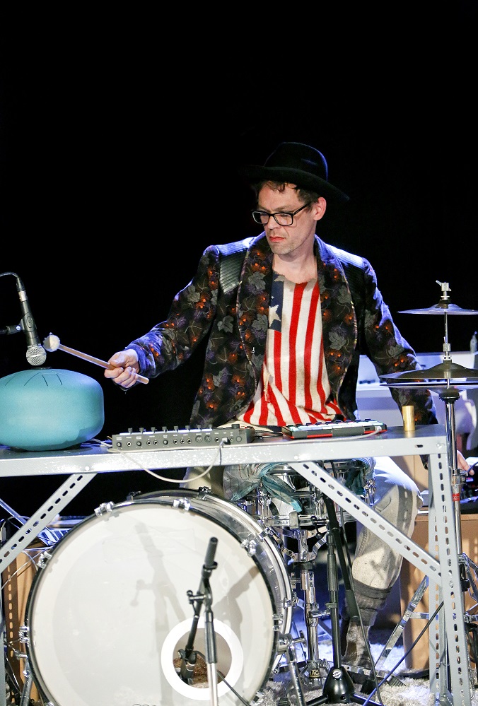 Loos ist selber mit dem Schlagzeug auf der Bühne, wobei die ausgewählte aus dem Off kommt. Sie wird mit dem Fortschreiten der Handlung düsterer. Auf drei Video-Leinwänden wird die Handlung durch intensiv recherchierte Einspielungen von Mario Simon unterstützt.