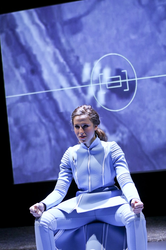 „Am Boden“ erzählt die Geschichte einer erfolgreichen, weiblichen „Top Gun“ Pilotin. George Brant hat die Story einer real existierenden US Air Force Pilotin als Grundlage seines Stückes gewählt. Die „Ich“-Erzählerin auf der Bühne (Alexandra Sinenikova) wurde nach ihrem Schwangerschaftsurlaub zurück in die Heimat nach Nevada versetzt. Sie, die sich mit dem Geschlecht „Pilot“ definiert, kann nun nicht mehr durch das endlose Blau des Himmels jagen, sondern muss stattdessen im US Wüstenstaat an einem Bildschirm sitzen und Kampfdrohnen durch Afghanistan navigieren.