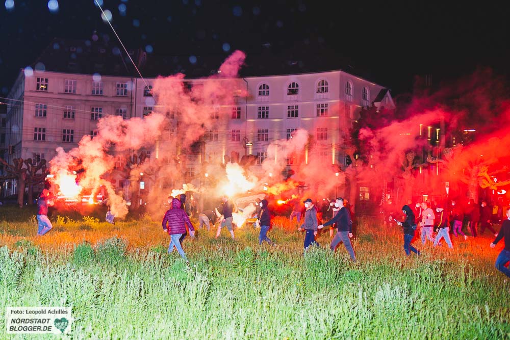 Dennoch wurde es auf dem Borsigplatz etwas voller. Eine halbe Stunde nach dem Abpfiff tauchte hier die erste Ultra-Gruppe mit ca. 50 Menschen auf. Masken trugen nur etwa die Hälfte von ihnen. Die Polizei setzte die Gruppe fest und nahm Personalien auf. Wenig später kamen weitere Gruppen aus anderen Straßen. Gemeinsam stürmten sie auf die Platzmitte und zündeten Pyrotechnik an. Ein Flammenmeer aus Bengalos, Feuerwerks-Batterien und Böllern entstand auf dem Borsigplatz.