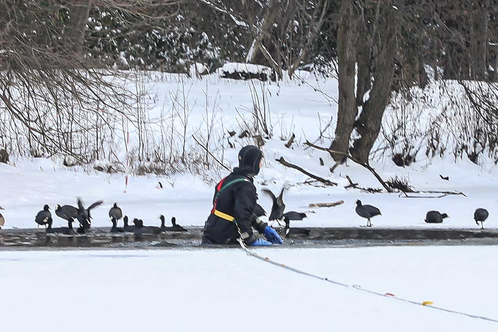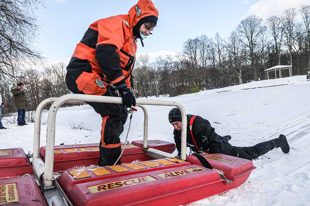 - Wer sich zum Helfen auf die Eisfläche begibt, sollte dafür eine Unterlage (Leiter, Bretter, Zaun, Hockeyschläger) verwenden, um das Gewicht zu verteilen. Die Hilfsmittel kann man der eingebrochenen Person zuschieben. Eine quer über die Einbruchstelle gelegte Unterlage oder Äste machen die Rettung leichter. Hilfreich können auch an Gewässern aufgehängte Rettungsringe sein.