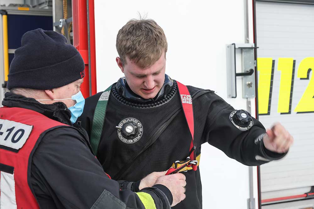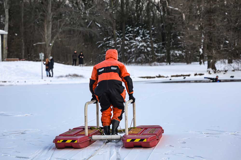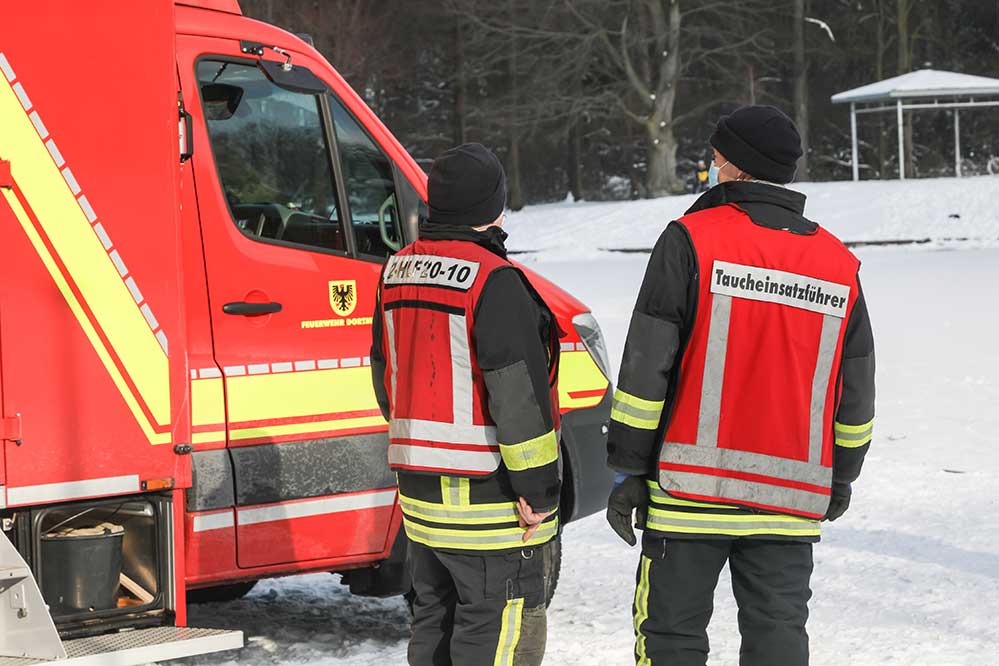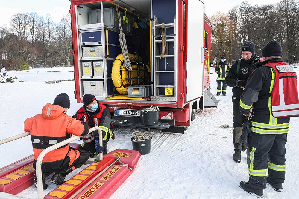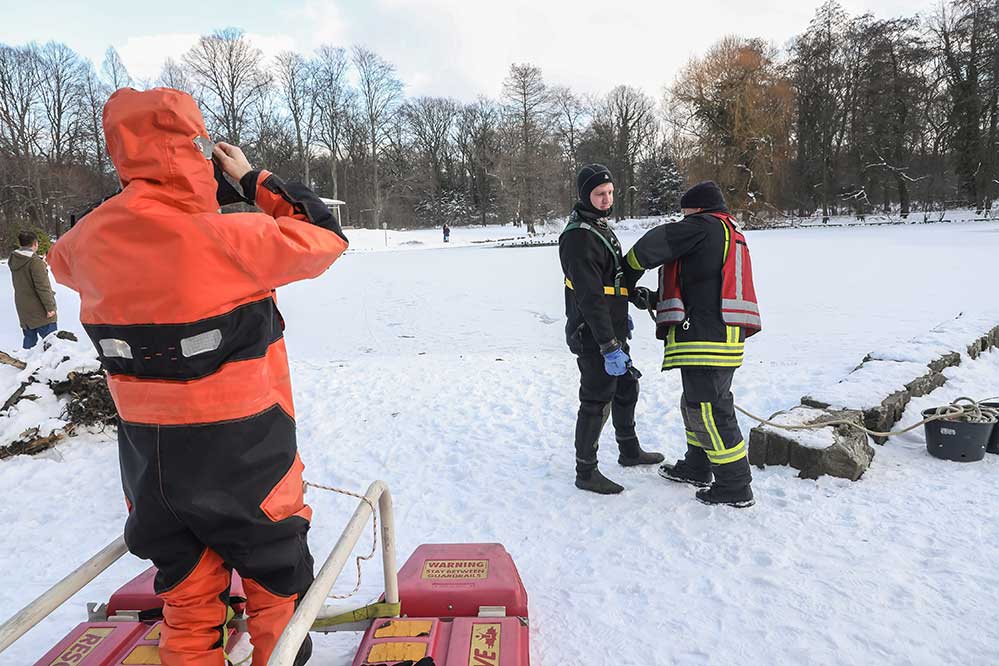 Rufen Sie im Unglücksfall sofort die Feuerwehr über den Notruf 112 und betreten Sie selbst die Eisfläche bitte nicht, denn damit bringen Sie sich selbst in Gefahr. Nutzen Sie entsprechende Rettungsringe oder Seile, die im Regelfall an Gewässern als Sicherheitseinrichtungen vorhanden sind.