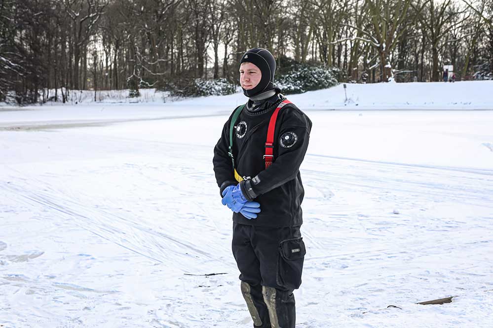 Im Wasser verliert der Körper durch das kalte Wasser schnell an Kraft, sodass die eingebrochene Person nach kurzer Zeit untergehen kann. Warme Kleidung, die sich vollsaugt trägt mit dazu bei. Die Gefahr ist groß, dass der Körper sogar unter die Eisfläche gerät.