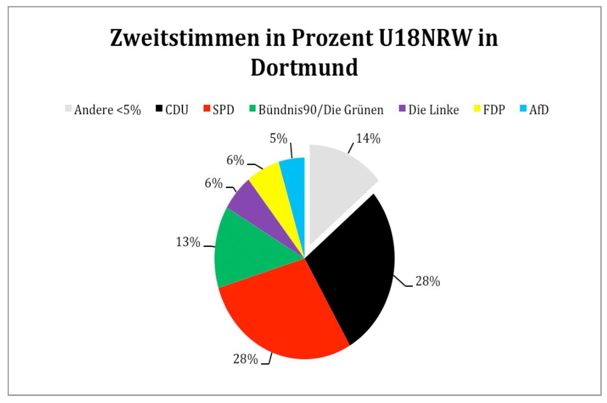 Die SPD konnte mit 27,32 Prozent der abgegebenen Wählerstimmen die Mehrheit für sich verbuchen, knapp gefolgt von der CDU mit 26,45 Prozent. Bündnis 90/Die Grünen kommen bei den jungen Menschen in Dortmund auf 12,56 Prozent und liegen damit komfortabel vor der FDP mit 5,75 Prozent und den Linken mit 5,61 Prozent, die beide nur knapp die Sperrklausel übersprungen haben. Alle anderen Parteien schafften dies nicht.