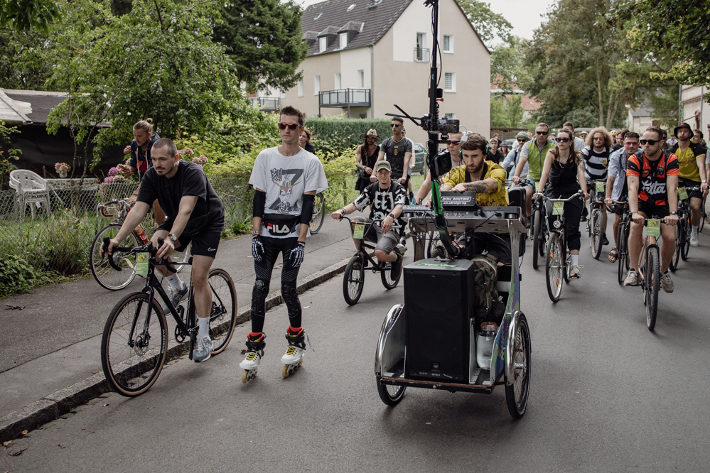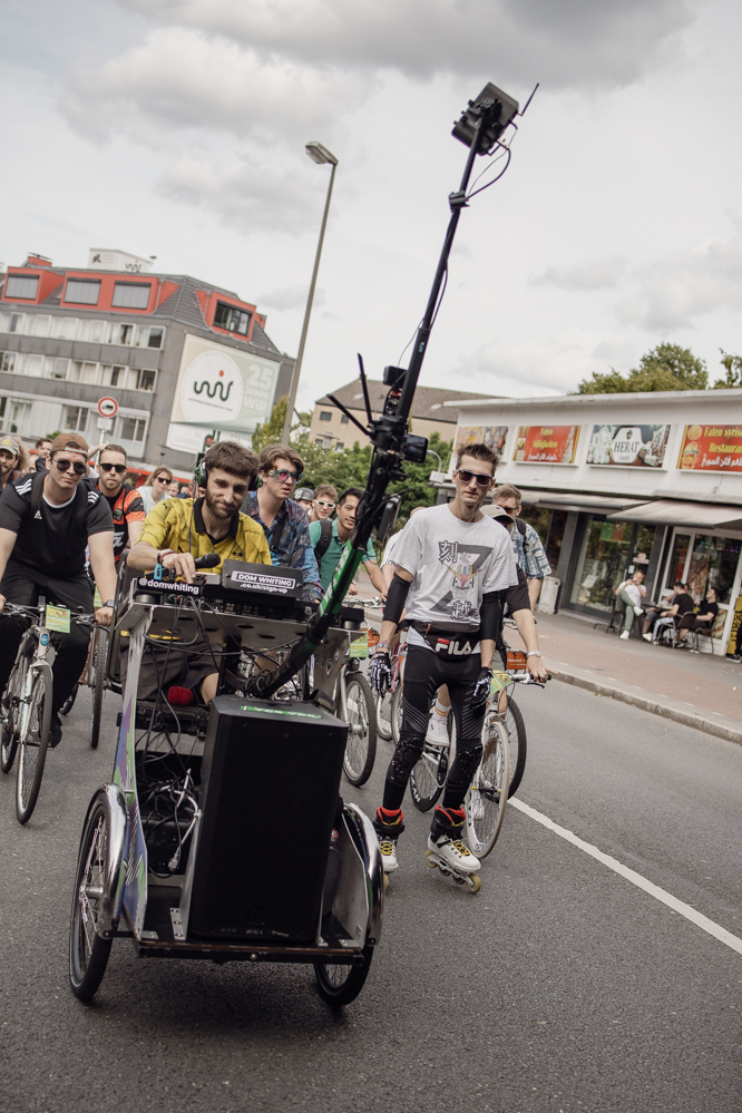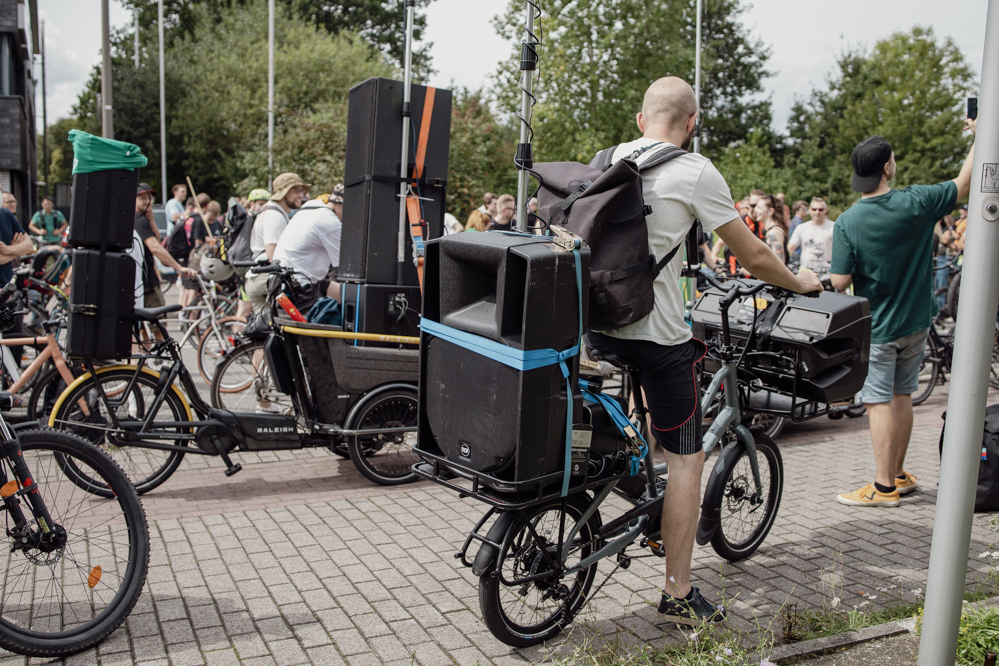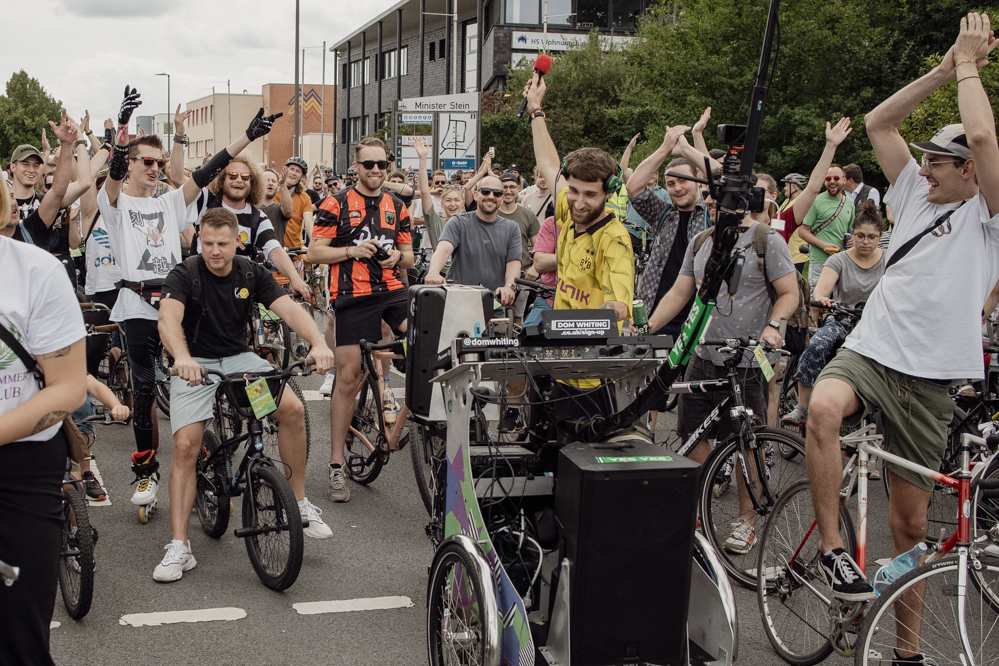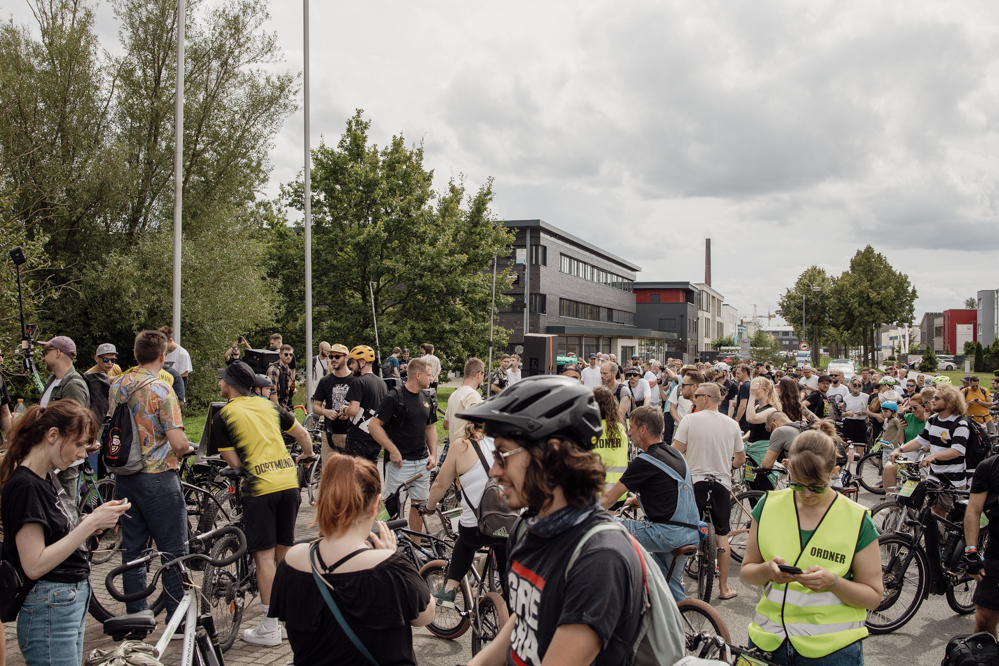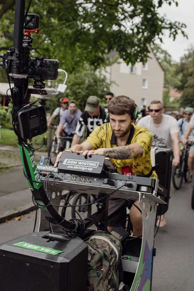 Für die Demonstration in Eving konnten die Organisator:innen den aus dem Internet bekannten DJ Dom Whiting gewinnen. In Großbritannien fahren regelmäßig Tausende mit ihm und seiner Musik durch die Straßen. Auf YouTube haben seine Videos hunderttausende Aufrufe. Dortmund ist der dritte Besuch des DJs in Deutschland – Berlin, Frankfurt und nun die Ruhr-Metropole. Auf Facebook wurde der Rave vom Rad aus Dortmund live in die ganze Welt übertragen.