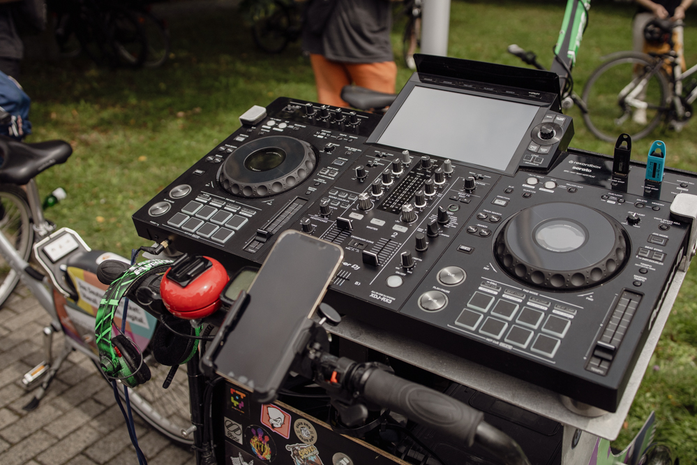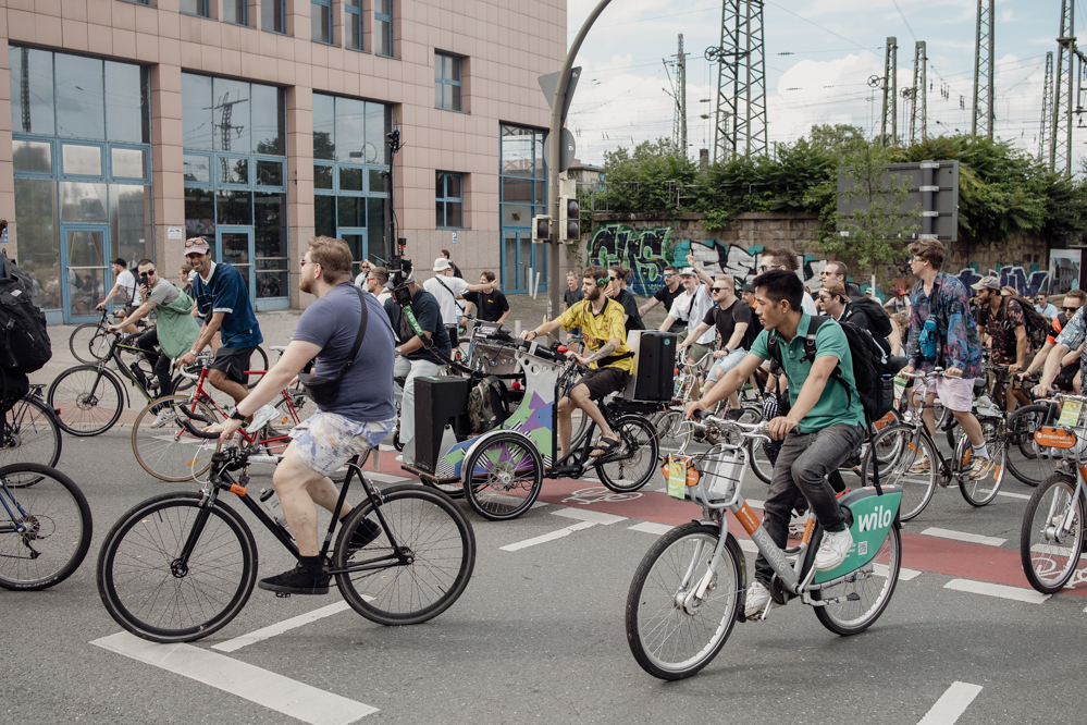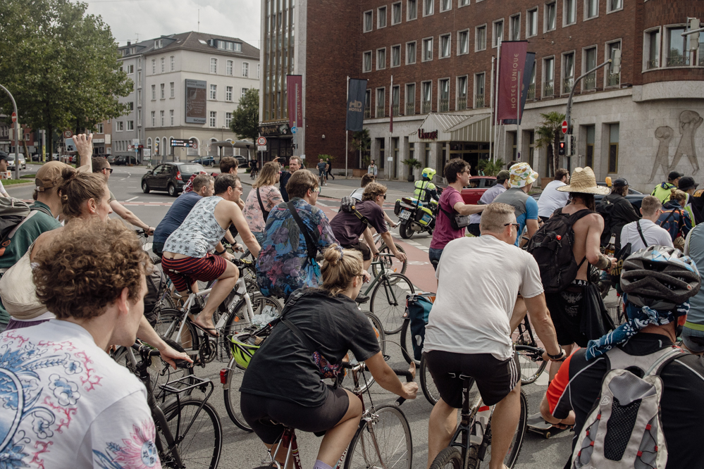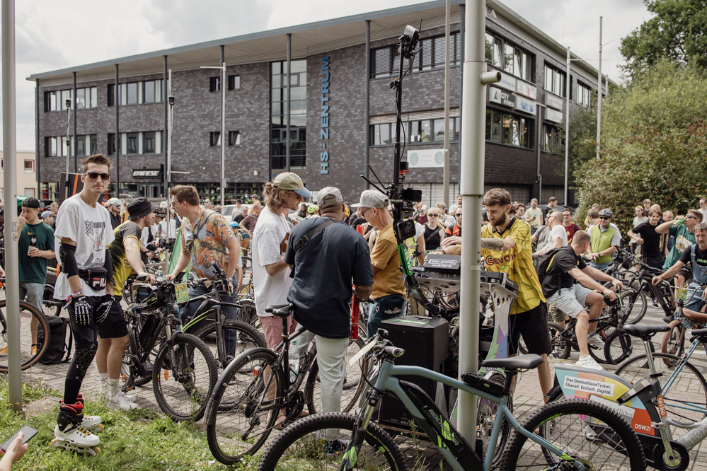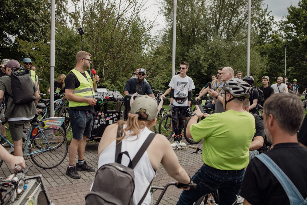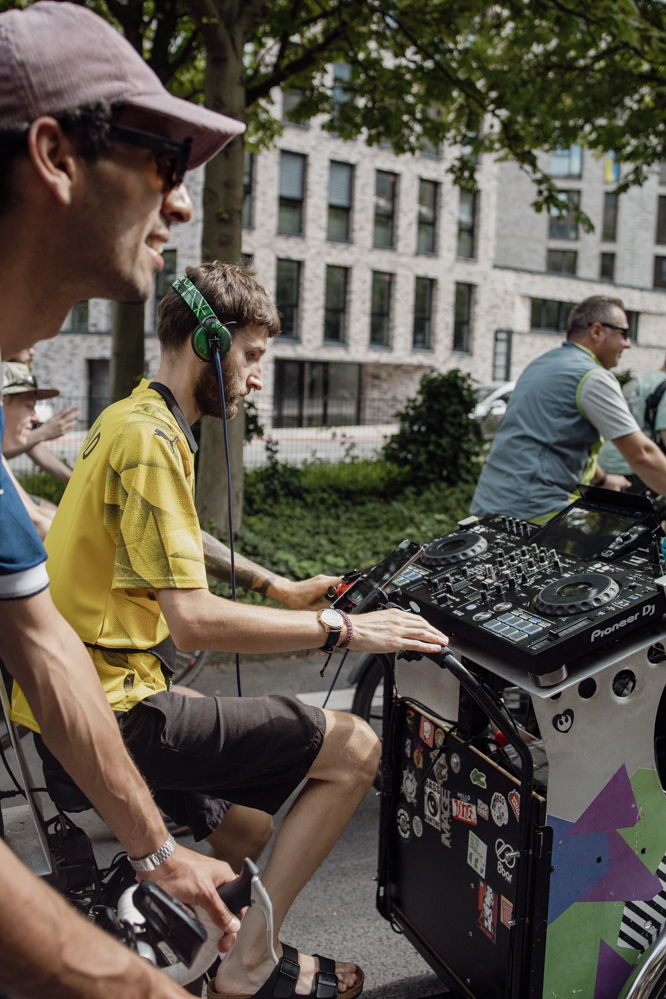 Für die Demonstration in Eving konnten die Organisator:innen den aus dem Internet bekannten DJ Dom Whiting gewinnen. In Großbritannien fahren regelmäßig Tausende mit ihm und seiner Musik durch die Straßen. Auf YouTube haben seine Videos hunderttausende Aufrufe. Dortmund ist der dritte Besuch des DJs in Deutschland – Berlin, Frankfurt und nun die Ruhr-Metropole. Auf Facebook wurde der Rave vom Rad aus Dortmund live in die ganze Welt übertragen.