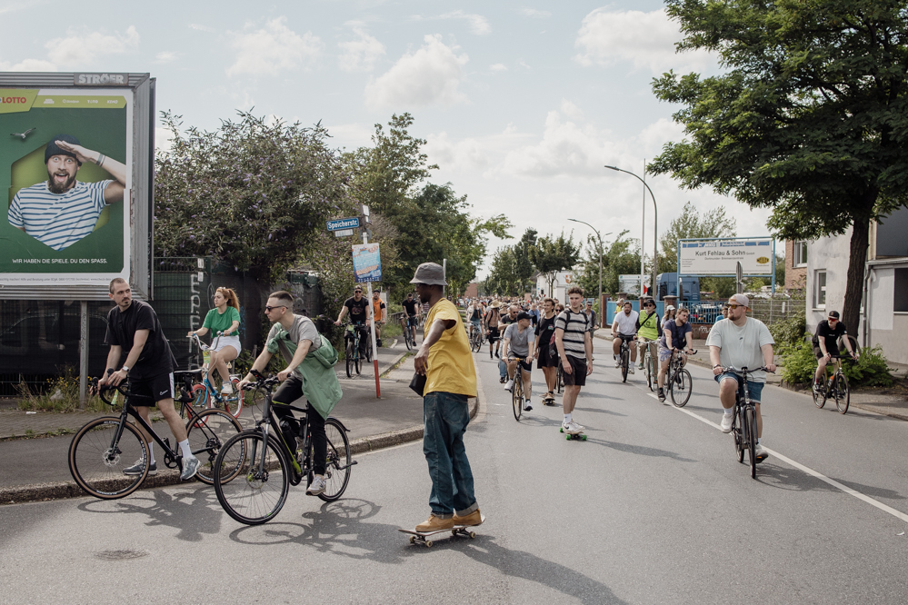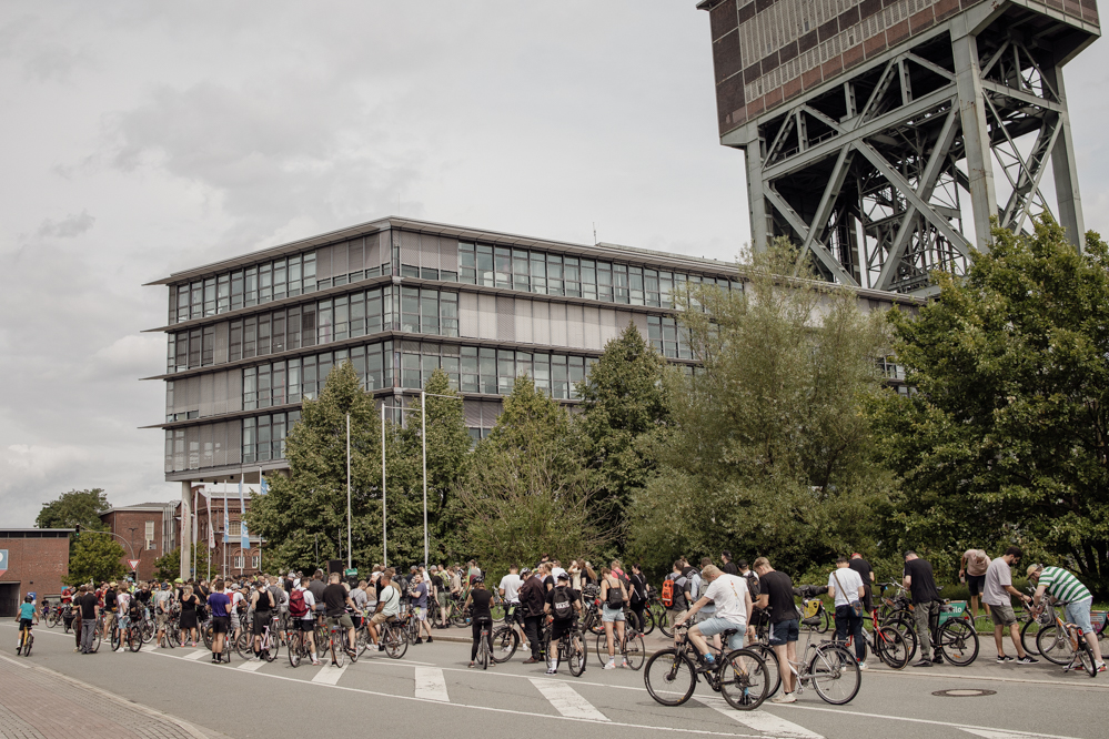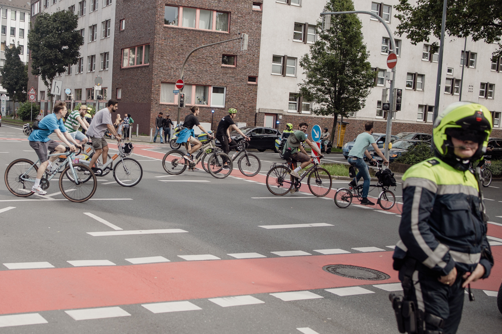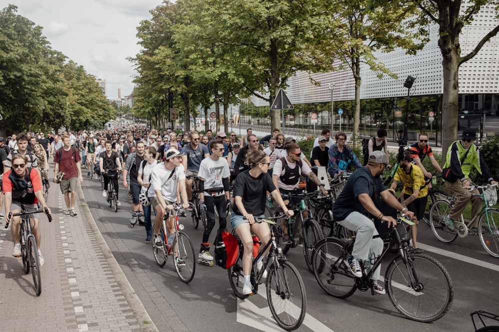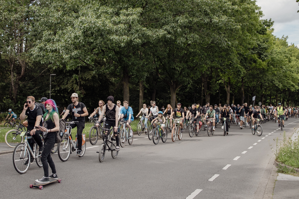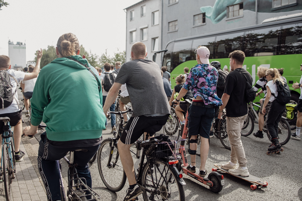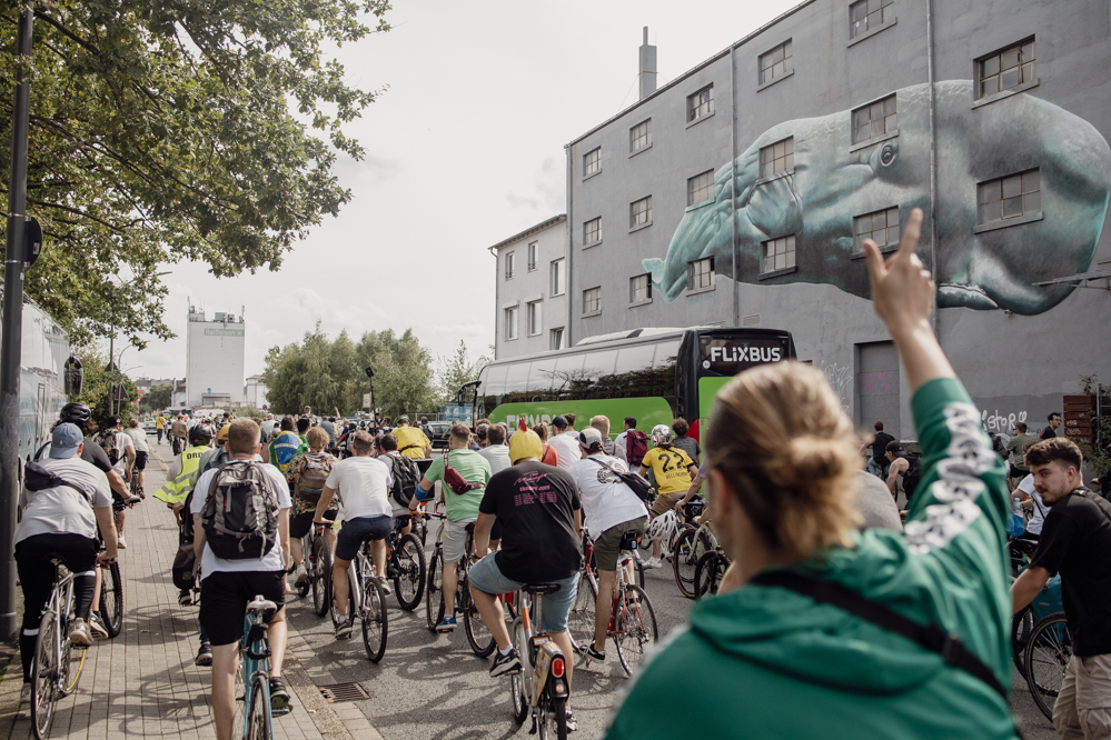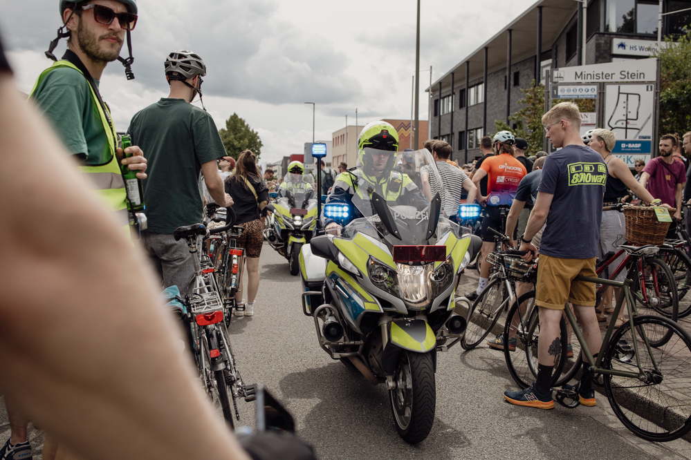 500 Teilnehmende hatte der Evinger Hendrik Blom für die Fahrraddemonstration in Eving angemeldet. Einen wirklich genauen Überblick wie viele es dann tatsächlich geworden sind, hat am Sonntag Nachmittag niemand. Über 1000 Menschen dürften es aber auf jeden Fall sein. Immerhin dauert es vier Minuten, bis die ganze Demonstration an den erstaunten Passant:innen vorbei ist. Viele Anwohner:innen zeigen sich zunächst irritiert, aber lassen sich dann von der guten Stimmung anstecken.