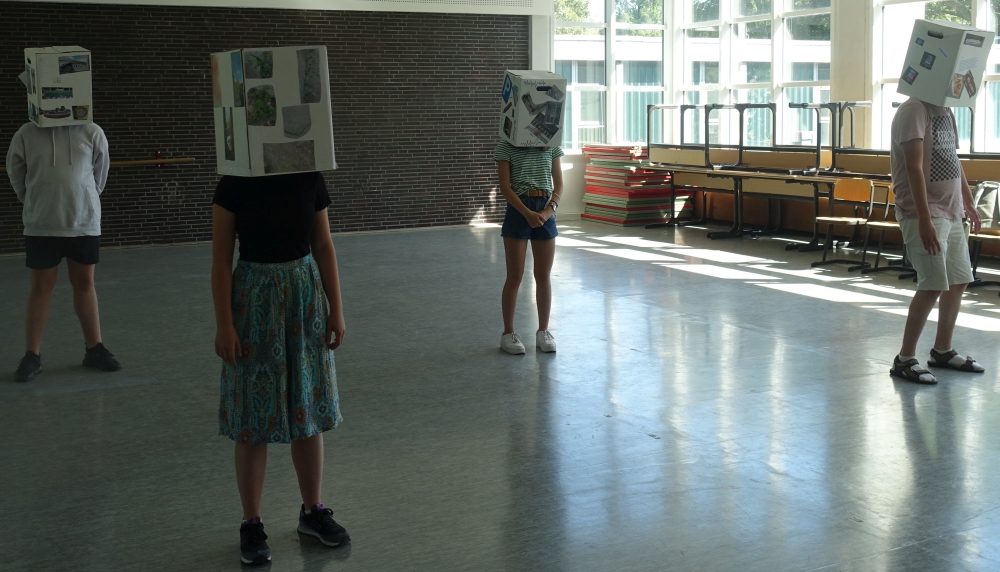 Einige Jugendliche aus dem Workshop „Create your own City“. Unter der Leitung von unter anderem Birgit Götz gestalteten sie Höcker, und wie zu sehen ist, fungieren sie auch als Mundschutz bzw. eher als Helm.