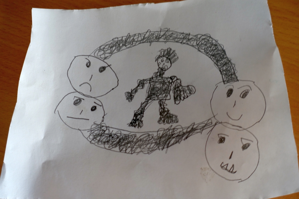 Aber wie eingangs erwähnt wurde nicht nur geschrieben oder gemalt in der vergangenen Woche, es wurden auch Tanzchoreographien entworfen. Andreas Ksienzyk (Kinder- und Jugendtheater) gestaltete zusammen mit den Kindern ein Straßentheater. Das Stück entwickelte sich von einem Gefühl der Starre bis hin zu einer Art Trance. Die musikalische Untermalung bekräftigte dieses Gefühl. Die Kinder nahmen dabei die Gestalt von „Puppen-Robotern“ an. Nach Perfektion der Proben gingen sie zusammen in die Innenstadt, um es den Passant*innen dort vorzustellen.