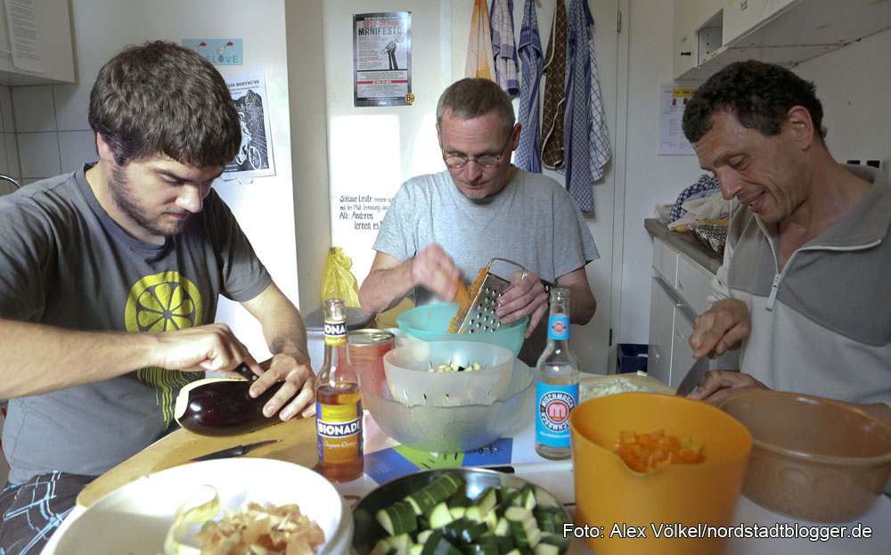 Alle Menschen, die ein Problem mit ihren Rädern haben, sind willkommen. „Das Fahrrad machen wir fertig – aber gemeinsam“, erklärt Niels. „Wir sind kein Dienstleister!“ Fachsimpeln, Austausch, Nachbarschaftshilfe und lecker essen. Aber vegan. Johannes ist beim „Vegan Street Day” auf das Angebot in der Nordstadt aufmerksam geworden und kommt seitdem montags vorbei. Mit dem Fahrrad – aus Oberhausen! „Irgendwie dachte ich, dass es wenig Veganer gibt, die Radfahren und politisch denken.“ In der VeloKitchen ist er mit seiner Einstellung nicht allein. Entstanden sind hier Freundschaften und Wohngemeinschaften.