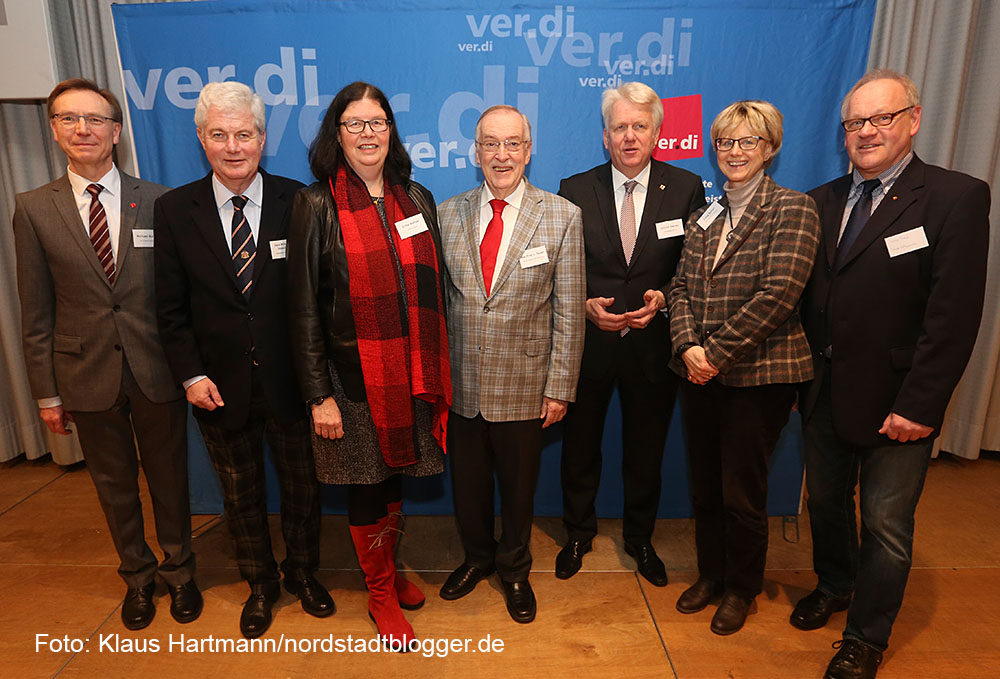 Neujahrsempfang der Gewerkschaft Verdi im Werkssaal der DSW. Gruppenfoto mit Ehrengästen. v. l.: Michael Bürger, Verdi;Hans-Werner Stodollik, Bürgermeister Lünen, Erika Wehde, Verdi; Manfred Sauer, Bürgermeister, Oberbürgermeister Ullrich Sierau, Jutta Reiter, DGB und Jürgen Paul, stellv. Bürgermeister Schwerte