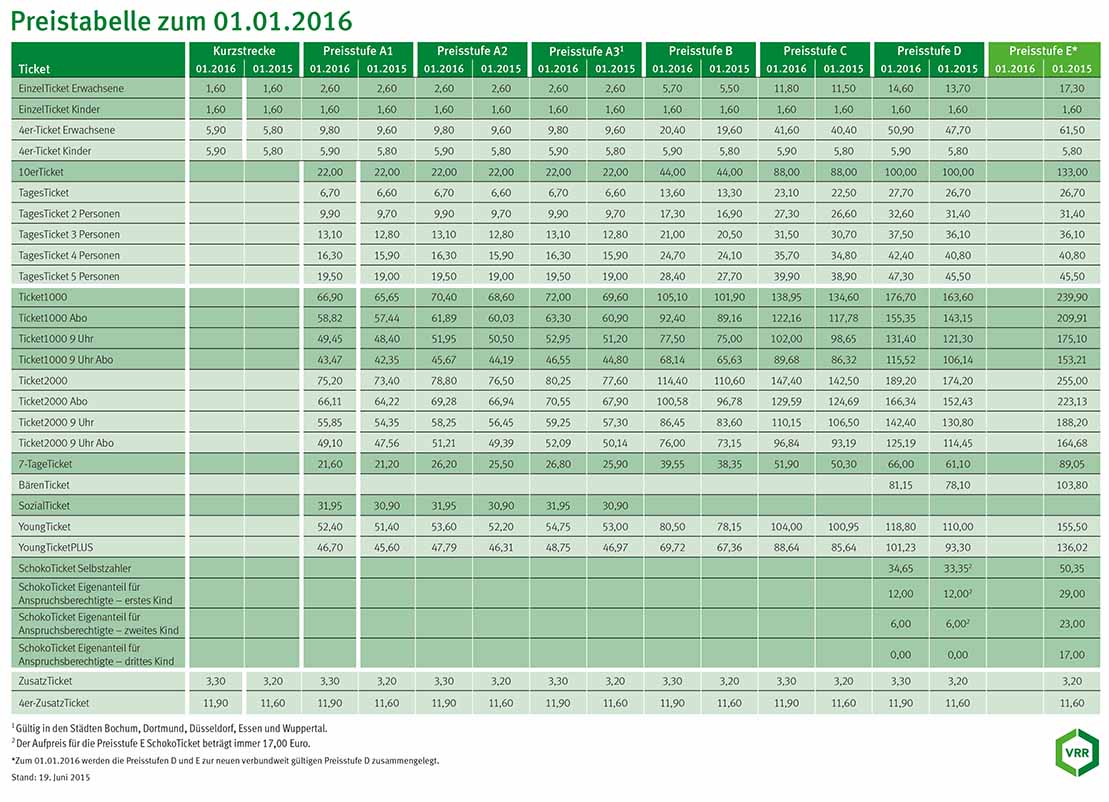 Durch die Zusammenführung der beiden Preisstufen werden die Preise für das Schoko-Ticket (für Schüler/ innen) und das Bären-Ticket (für Fahrgäste ab dem vollendeten 60. Lebensjahr) sowie für das Young-Ticket und das Young-Ticket PLUS in der Preisstufe D zwar überdurchschnittlich angehoben, dafür sind sie ab Januar 2016 aber im gesamten VRR gültig.