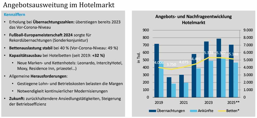 Der Hotelmarkt hat die Folgen der Pandemie inzwischen überwunden. Die Übernachtungszahlen liegen wieder über dem Vorkrisenniveau, zusätzliche Impulse kamen durch Großveranstaltungen wie die Fußball-Europameisterschaft. Gleichzeitig ist die Kapazität deutlich gestiegen.