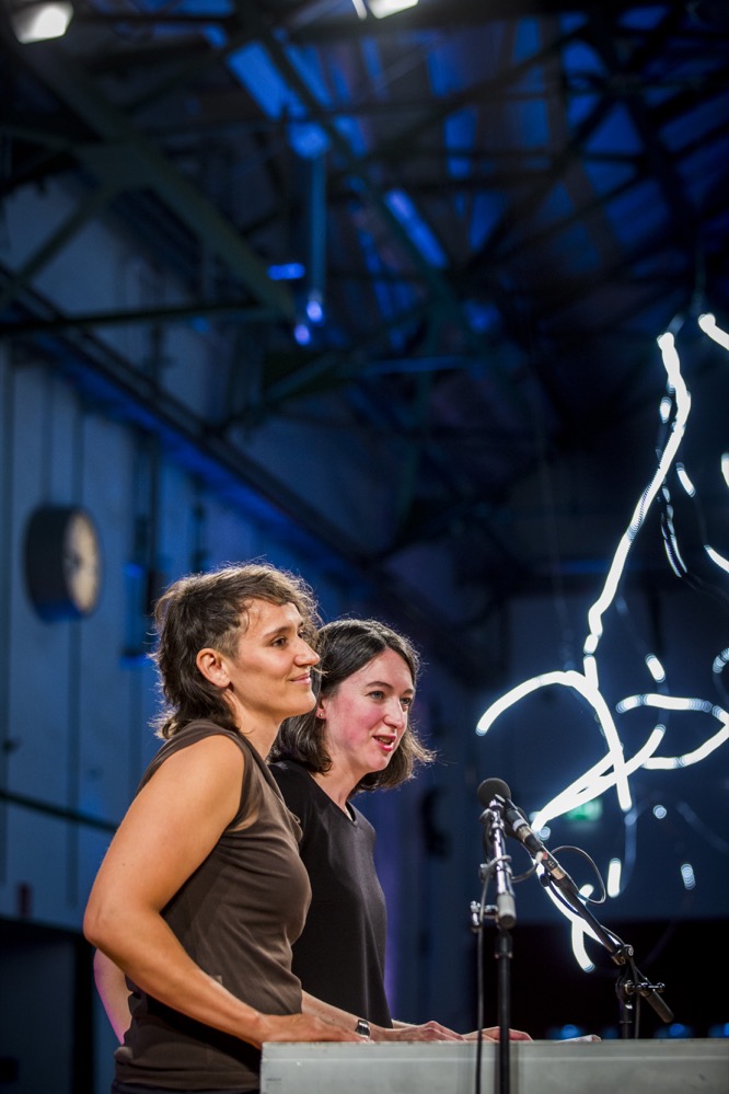 Frau Dr. Ursula Sinnreich, Generalsekretärin der Kunststiftung, sprach sich anschließend für die wichtige Rolle der Kunst für die Gesellschaft in schwierigen Zeiten aus. Sie lobte den Mut der beiden Festivalleiterinnen Fanti Baum und Olivia Ebert, ein Festivalprogramm ohne Motto und definitive Zuschreibungen aufzustellen, das Raum für Experimente lässt.