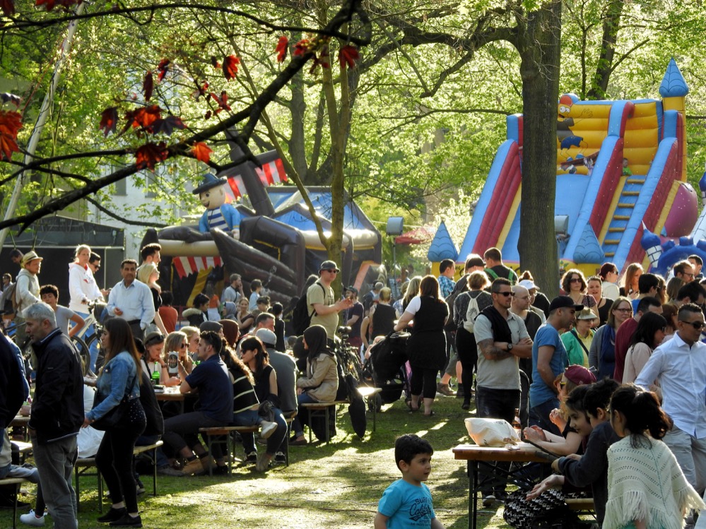 Auf der Wiese im Park gibt es zahlreiche Mit-Mach Aktionen und Infostände aus dem Quartier. Ab 14 Uhr gibt es ein Bühnenprogramm, welches Dortmunder Gruppen und Institutionen gestalten.