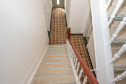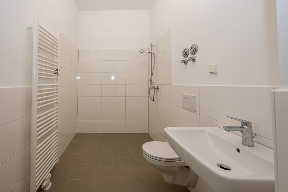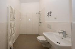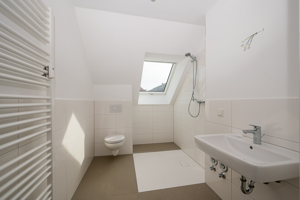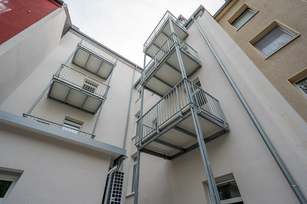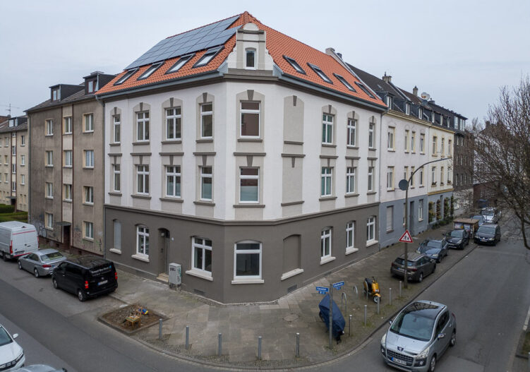 Wie das Ergebnis heute aussieht, zeigt sich bei der anschließenden Begehung. Helle, weiß gestrichene Wände prägen die Wohnungen, während im Treppenhaus stellenweise der alte Steinboden erhalten geblieben ist. Moderne Technik wurde ebenfalls integriert: Auf dem Dach befinden sich Photovoltaik-Elemente, im Innenhof stehen Wärmepumpen für die Energieversorgung. Eine der Wohnungen ist bereits vermietet, Anfang April sollen weitere Mieter:innen einziehen.