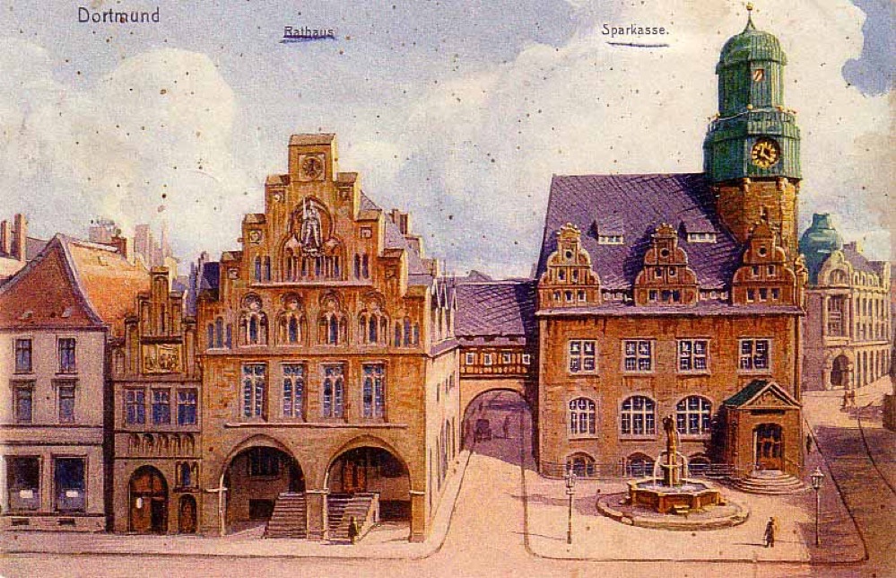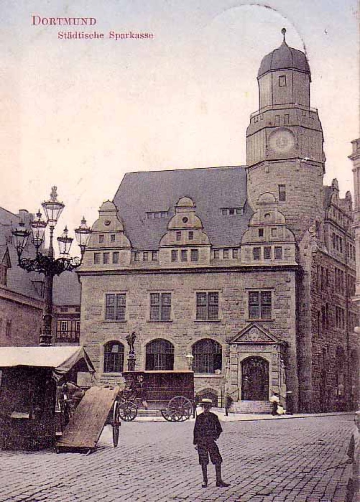 Die Sparkasse auf dem Alten Markt – links daneben das Dortmunder Rathaus. Archivbild: Sammlung Klaus Winter