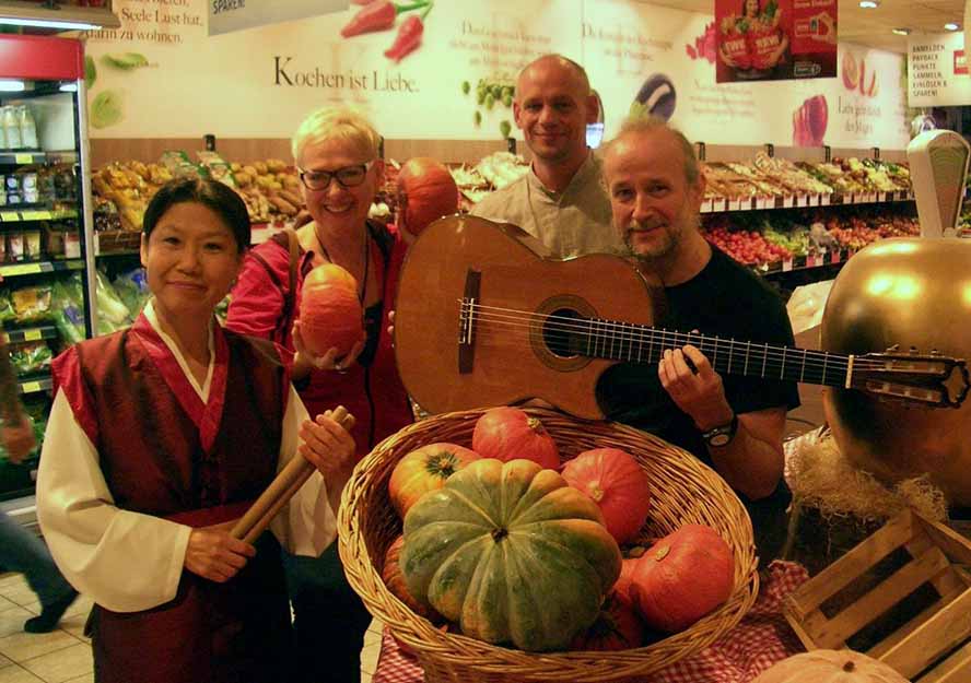 Erntedank findet diesmal sonntags im Supermarkt statt (5. Oktober). Kabarettistin Lioba Albus und das Transorient Ensemble spielen, scherzen und schlemmen zwischen Kürbiskörben, Kühltheke und Kasse.