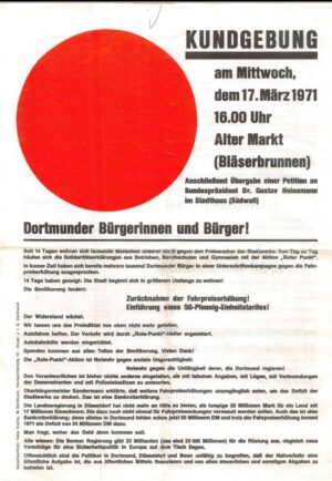 Der jüngste Warnstreik bei den Stadtwerken liegt erst hinter uns. Dass das wesentlich länger dauern kann, zeigt ein Blick zurück: Im März 1971 kam es in Dortmund zu wochenlangen Protesten gegen eine 30-prozentige Erhöhung der Nahverkehrspreise. Vor allem junge Menschen forderten die Rücknahme und einen niedrigen Einheitstarif. Ihr Mittel waren allabendliche Straßenbahnblockaden sowie eine organisierte Mitnahme in Privatautos. Symbol der Bewegung war – wie zwei Jahre zuvor in Hannover – der Rote Punkt.