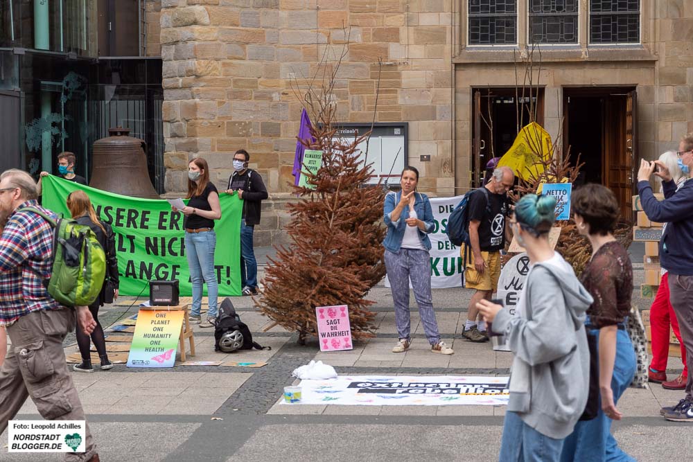 Durch die Klimaerwärmung erfährt auch Deutschland aktuell viel Waldsterben. Darauf haben heute Aktivist*innen der Gruppe „Extinction Rebellion“ in der Innenstadt Dortmunds aufmerksam gemacht. Mit dabei: ein Teil des bereits gestorbenen Waldes.