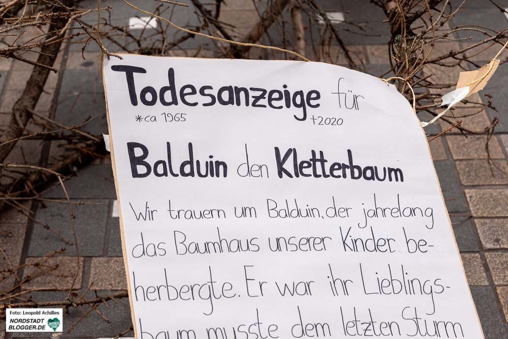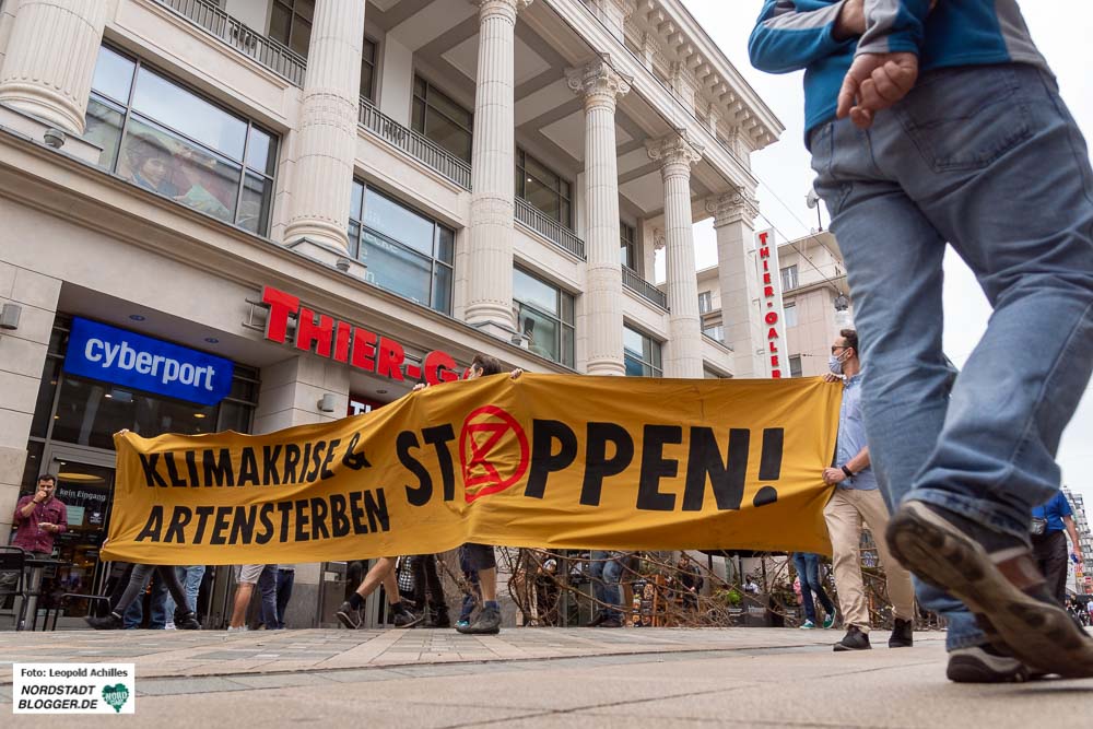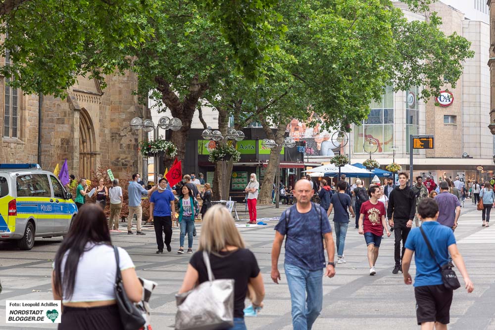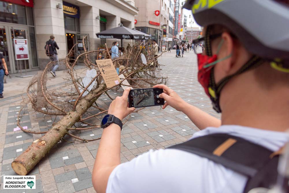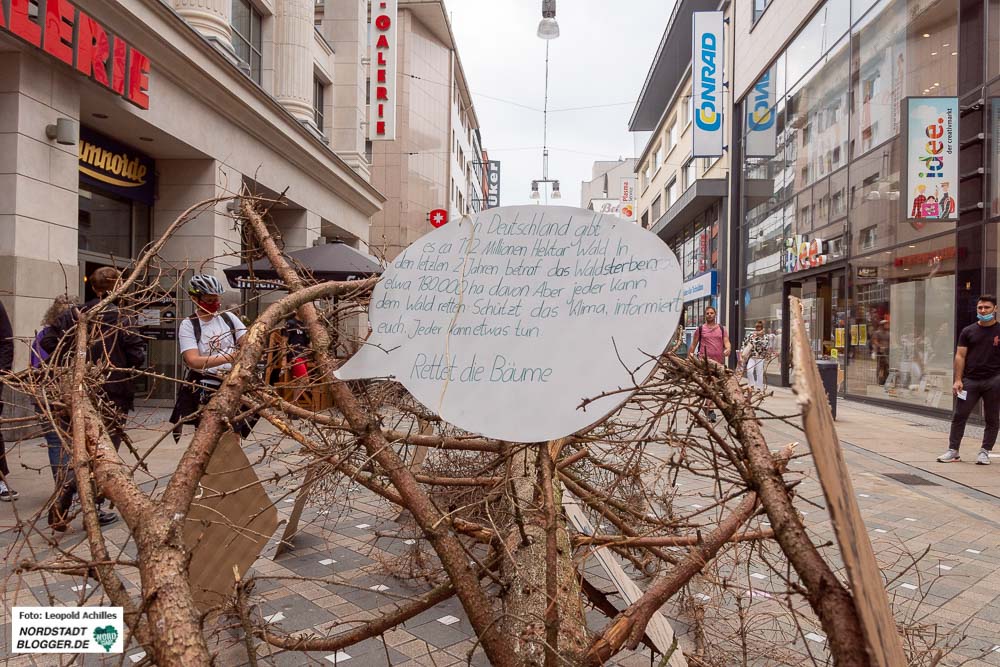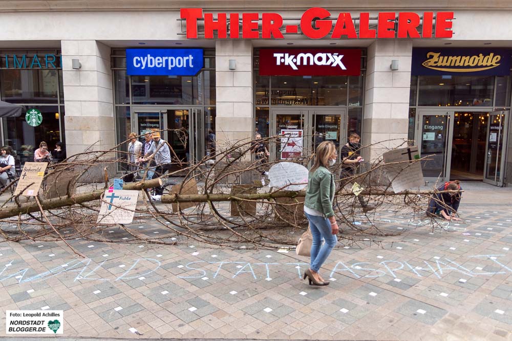 Vor der Thier-Gallerie fand sich zur gleichen Zeit ein weiterer Teil des bereits gestorbenen Waldes ein. Aktivist*innen platzierten einen rund acht Meter langen, stolzen, aber toten Nadelbaum mittig in der Fußgängerzone, genau vor dem Eingang der Thier-Gallerie auf dem Westenhellweg.