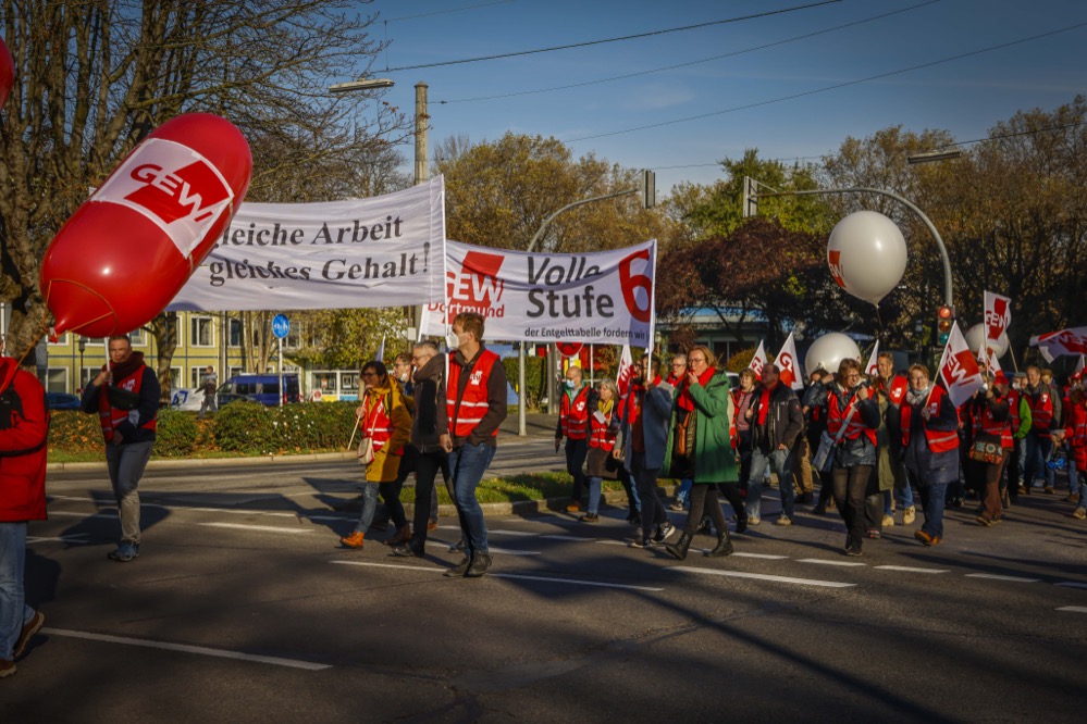 Am zweiten Warnstreiktag im November 2021 beteiligten sich heute in Dortmund rund 300 Personen, trotz der außergewöhnlichen pandemischen Situation. Bereits am Dienstag waren 300 Beschäftigte in Köln und Bonn bei Warnstreiks auf die Straße gegangen, um für Anerkennung der geleisteten Arbeit zu kämpfen.