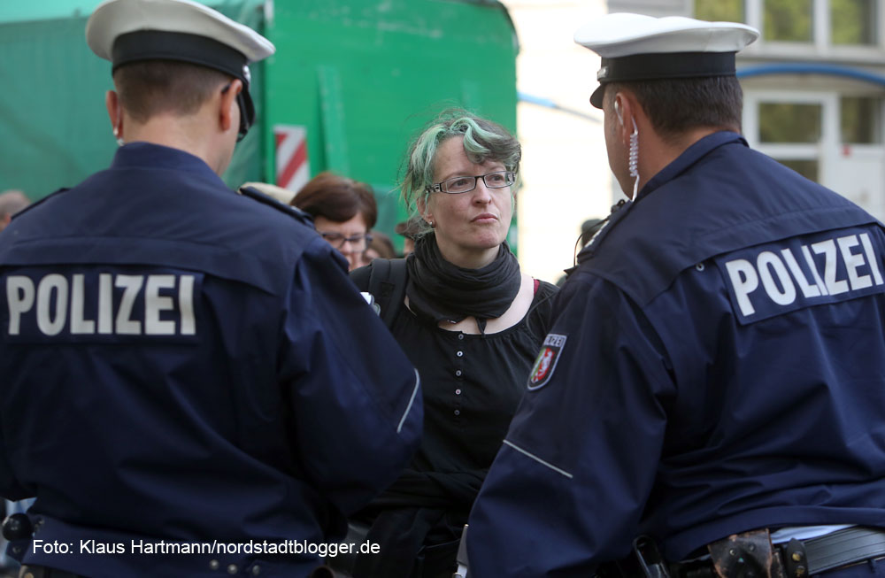 Auch die Polizei, die mit einem Großaufgebot die Demonstration von der Katharinentreppe in der Innenstadt über die Münsterstraße zur Polizeiwache Nord (dort gab es eine Zwischenkundgebung) bis zum Nordmarkt begleitete, musste sich sehr viel Kritik – und auch Beleidigungen – anhören.