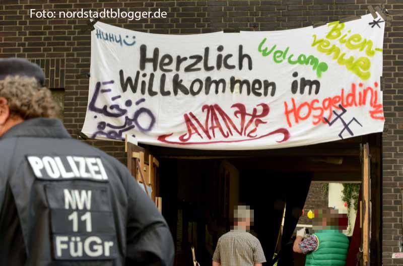 Birgit Rydlewski (MdL Piraten) war empört über die Art und Weise, wie sie von Beamten zurückgewiesen wurde: „Die Olle kommt hier auf keinen Fall rein“, bekam die Abgeordnete zu hören. Später wurde Birgit Rydlewski und Daniela Schneckenburger der Zugang in die Enscheder Straße gewährt. Von der gegenüberliegenden Straßenseite konnten sie Einblick in den Hof der Kirche nehmen. Der war mittlerweise mit Beamten in Zivil und Uniform bevölkert.