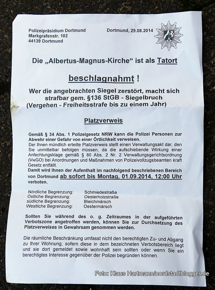 Die Besetzung ist damit beendet, auch wenn die Polizei nicht die Kirche, sondern „nur“ einen Tatort geräumt habe. Doch das Ergebnis ist dasselbe. Das Kirchen-Gebäude ist derweil als Tatort beschlagnahmt: Niemand darf es betreten – auch die Kirchengemeinde als Eigentümerin nicht. Frühestens Montag werde er erfahren, ob und wann die Gemeinde ihr Gebäude wieder betreten dürfe, erklärt Pfarrer Ansgar Schocke gegenüber nordstadtblogger.de. Zudem muss die Kirchengemeinde nun für eine Sicherung des Gebäudes sorgen.