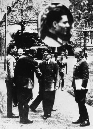 Am Führerhauptquartier „Wolfsschanze“.- vlnr: Claus Schenk Graf von Stauffenberg, Karl-Jesko von Puttkamer, unbekannt, Adolf Hitler und Wilhelm Keitel am 15.7.1944. Foto: Bundesarchiv