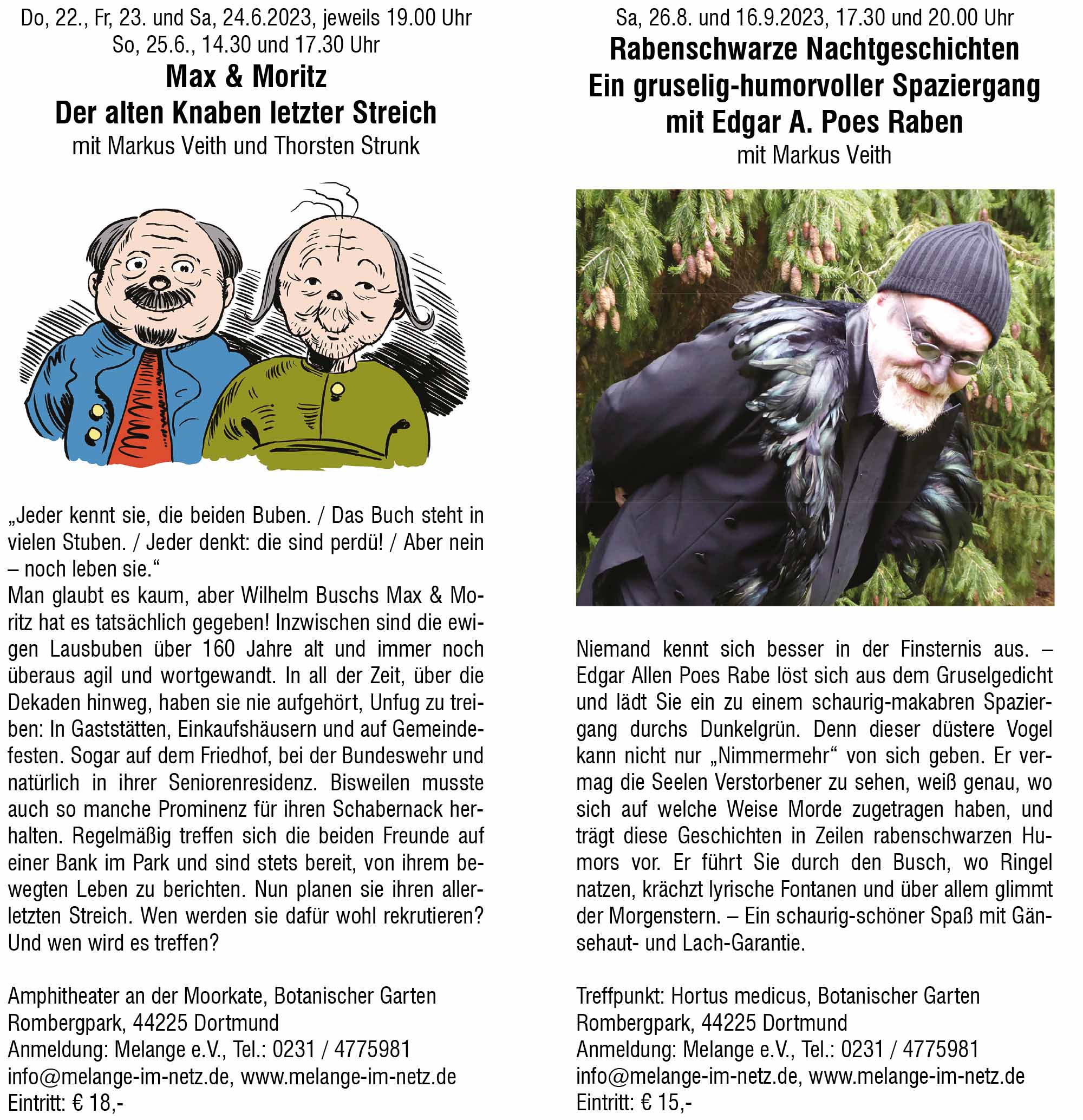 Außerdem will der Melange e.V. im Amphitheater an der Moorkate einige Kleinkunsttermine realisieren: Max & Moritz als alte Knaben werden mit fünf Vorstellungen ein ganzes Wochenende lang (22. bis 25. Juni) ihre Streiche präsentieren.