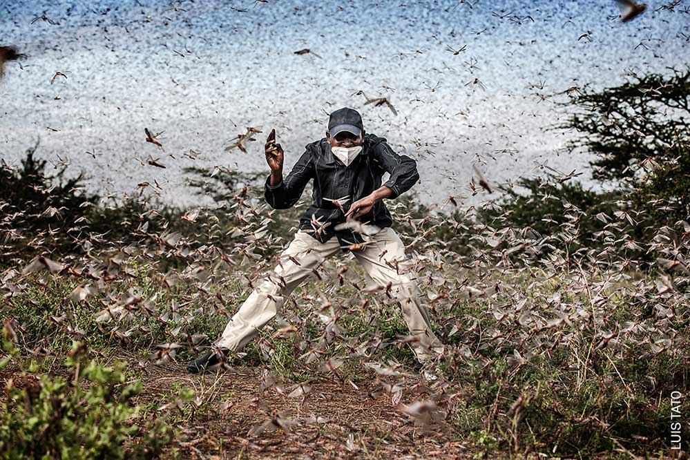 Nominiert für das Pressefoto des Jahres 2020: „Fighting Locust Invasion in East Africa“ von Luis Tato für die Washington Post. Zum Bildmotiv: Henry Lenayasa, Chef der Siedlung Archers Post im kenianischen Samburu County, versucht am 24. April, einen massiven Heuschreckenschwarm zu vertreiben, der die Weidefläche verwüstet. Heuschreckenschwärme verwüsteten große Landflächen, gerade als der Ausbruch des Coronavirus begonnen hatte, die Lebensgrundlagen zu stören.