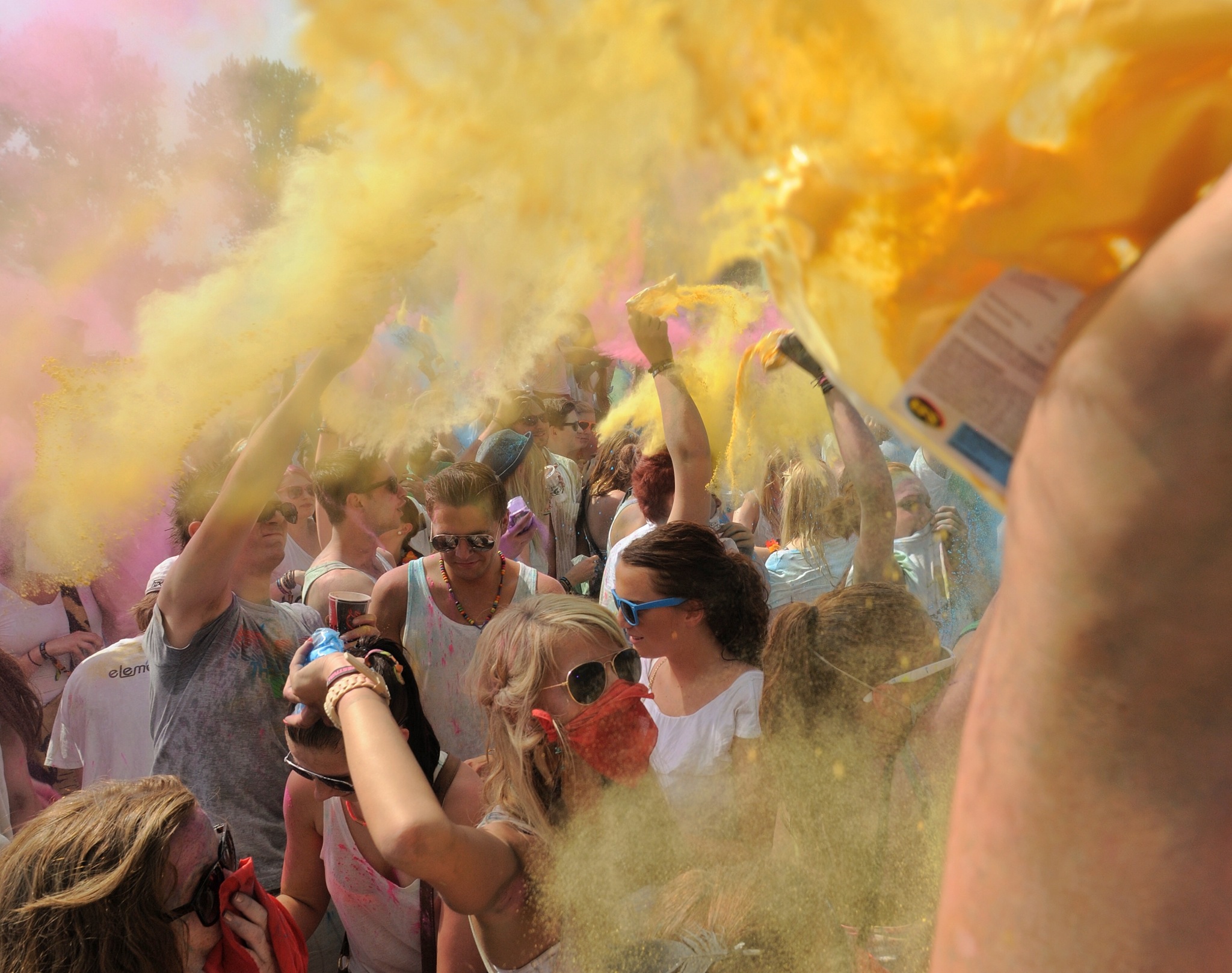NSB-Fredenbaumpark - Festival of Colours (13)Nun noch die „Schutzausrüstung“ für den Fotografen: Sonnenbrille, Schwimmbrille, Halstuch und Mundschutz sind für ein solches Festival richtig gut zu brauchen. Ganz abgesehen von alten Klamotten. Damit kann fast nichts mehr schiefgehen. Vor allem nicht dann, wenn man noch reichlich Folie, Klebeband und eine kleine Druckluftflasche zum Beseitigen des Staubs von der Frontlinse dabei hat. Damit trieb ich den farbigen Staub aus dem letzten Winkel – und den Kollegen den Neid in die Augen. Selbst das Handy hatte ich für den Tag ausgetauscht – die smarte Technik blieb zu Hause, das ausrangierte Klappgerät durfte mit.