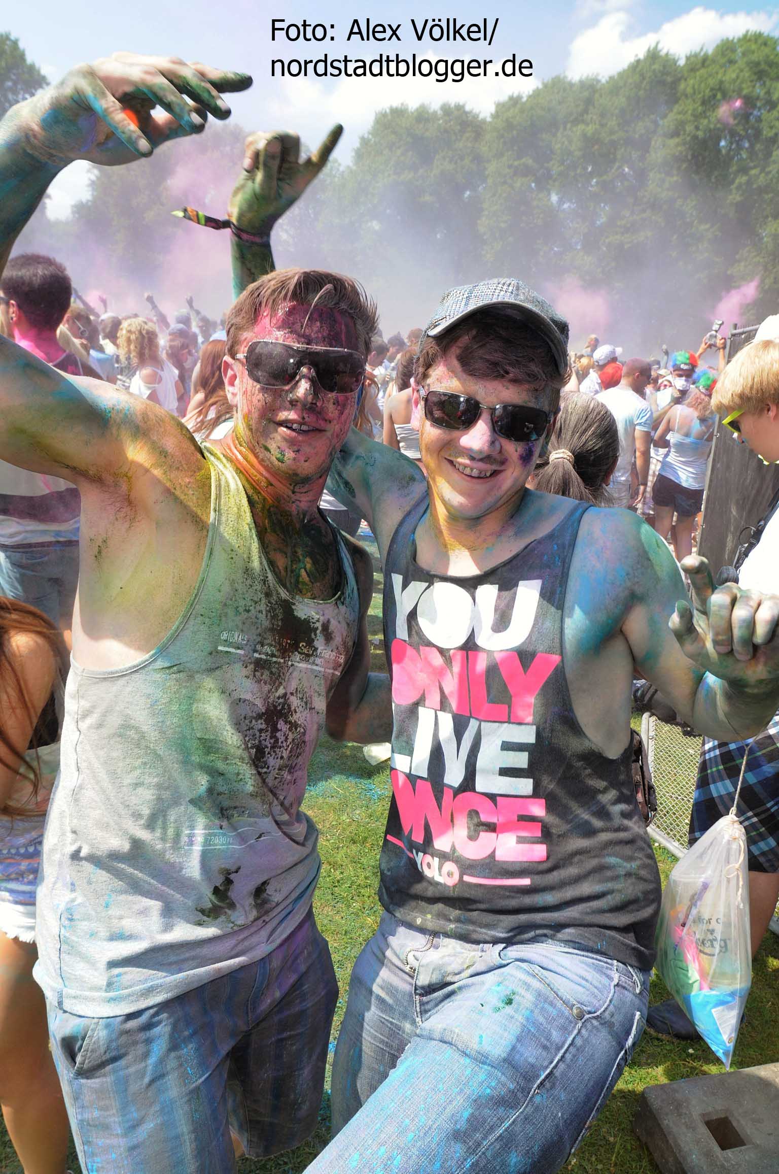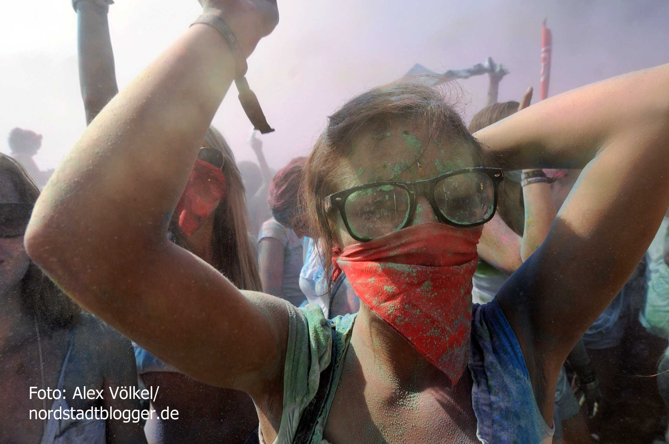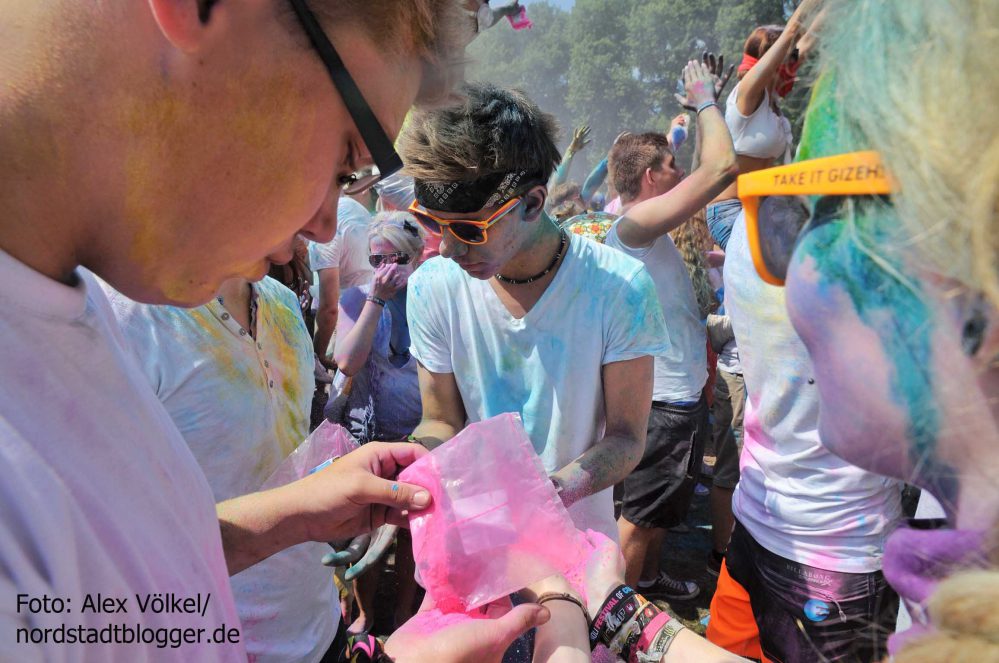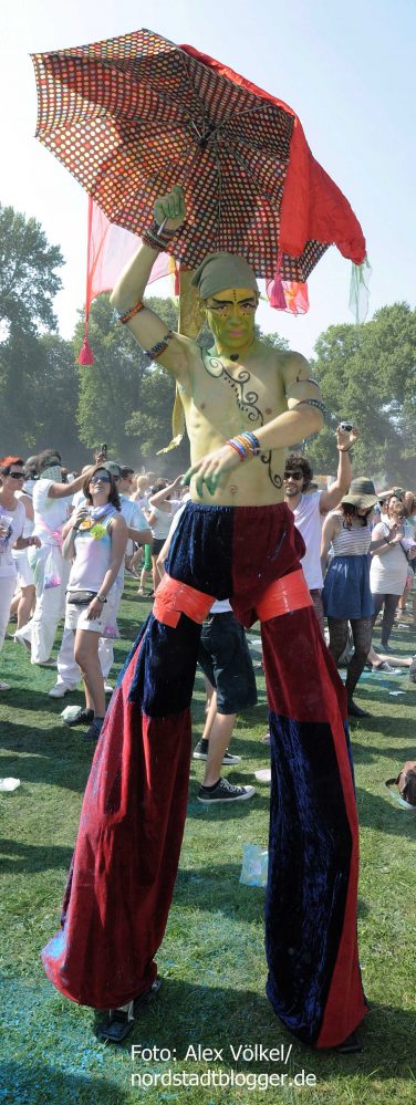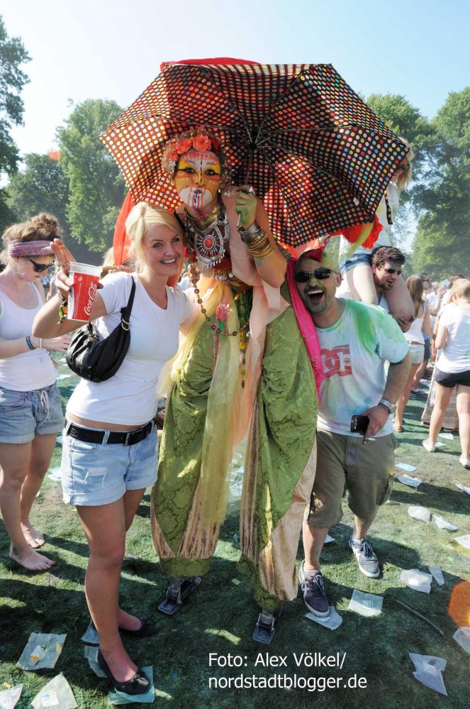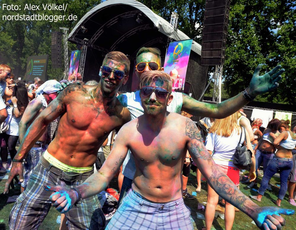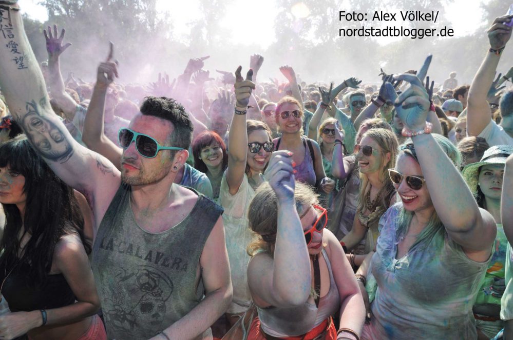 NSB-Fredenbaumpark - Festival of Colours (11)In Indien wird mit dem Farbenfest Jahr für Jahr der Frühling begrüßt. Die Menschen treffen sich, sie feiern, sie tanzen und werfen bunte Farben in den Himmel. Eine echte Pracht, die auch dafür sorgt, dass alle am Ende gleich aussehen und Alters- sowie Kastenunterschiede verschwinden. „Holi ist in Indien nicht nur ein Freudenfest. Es geht dabei auch um kulturelle Vielfalt, Toleranz und Respekt“, erklärt Organisator Max Riedel. Diese Idee haben die Veranstalter adaptiert und in ein musikalisches Festivalkonzept gegossen. Neben indischen Klängen waren vor allem moderne Sounds zu hören. Dafür zeichneten unter anderem Moguai und Aka Aka feat. Thalstroem verantwortlich. Für die indischeren Einflüsse sorgte das „Bombay Boogie Soundsystem“.