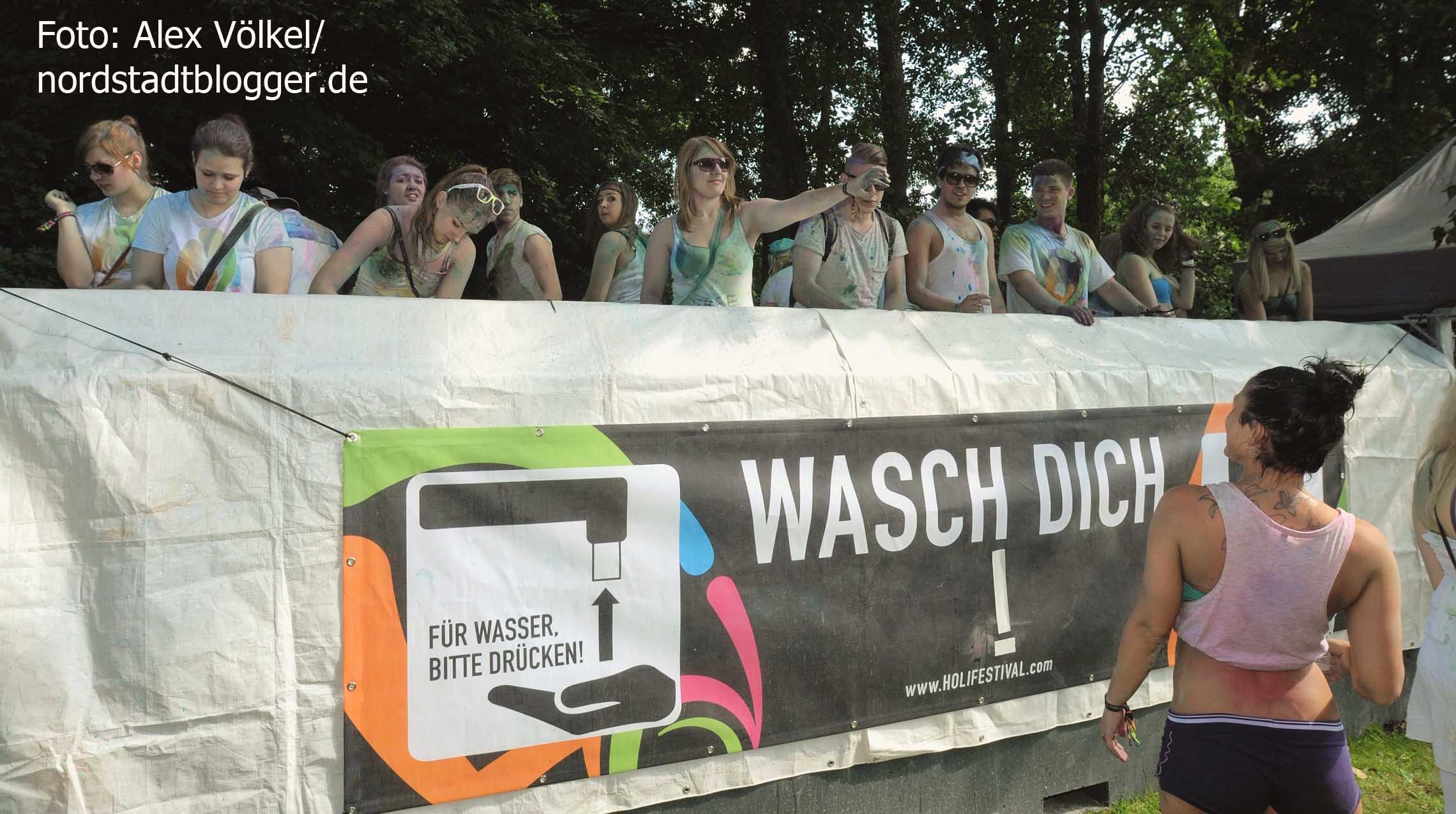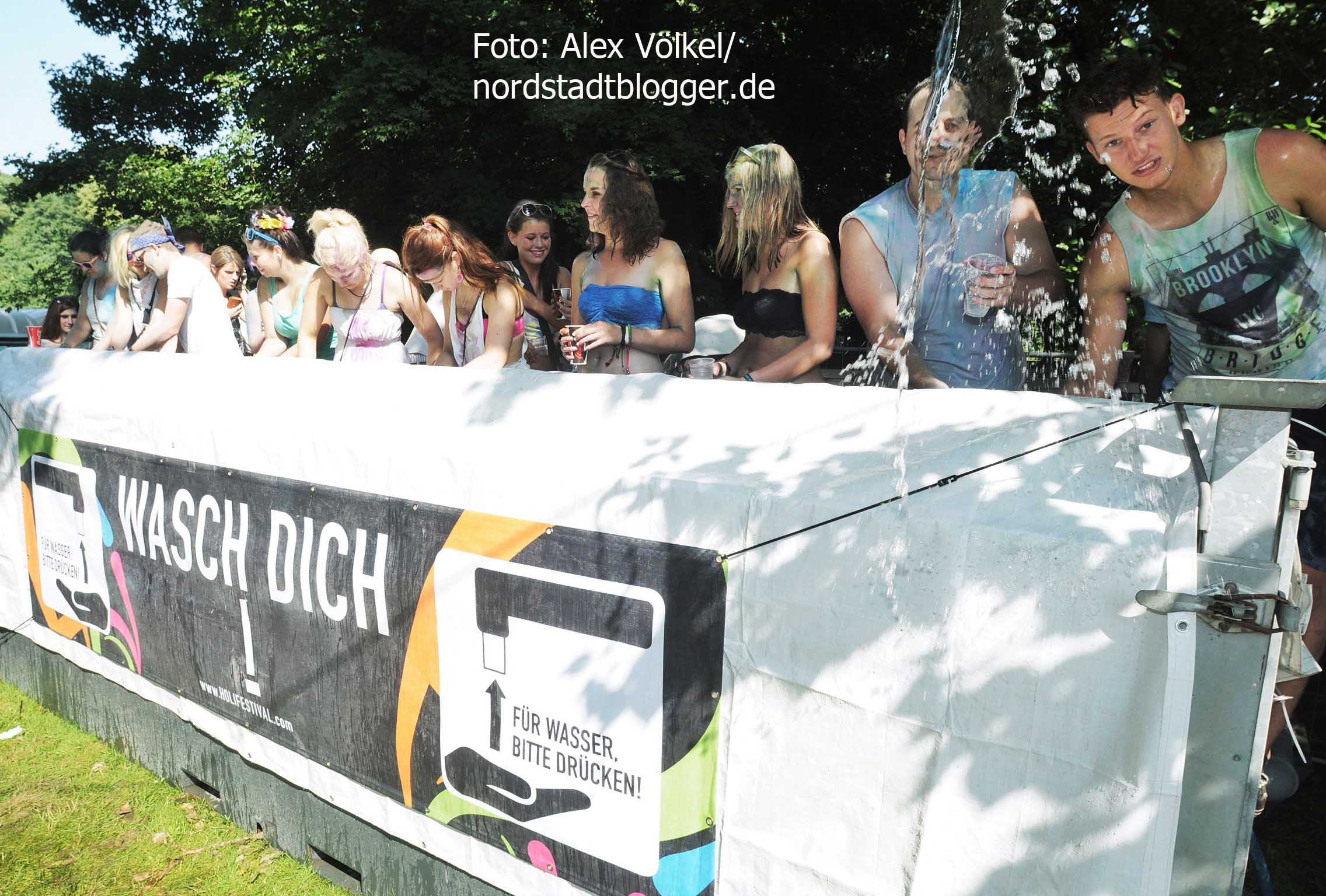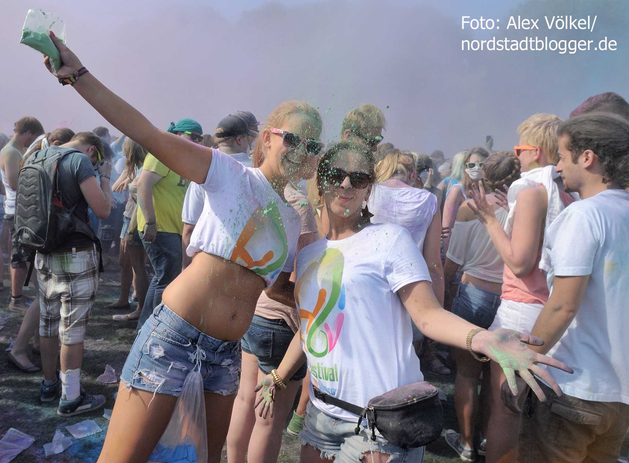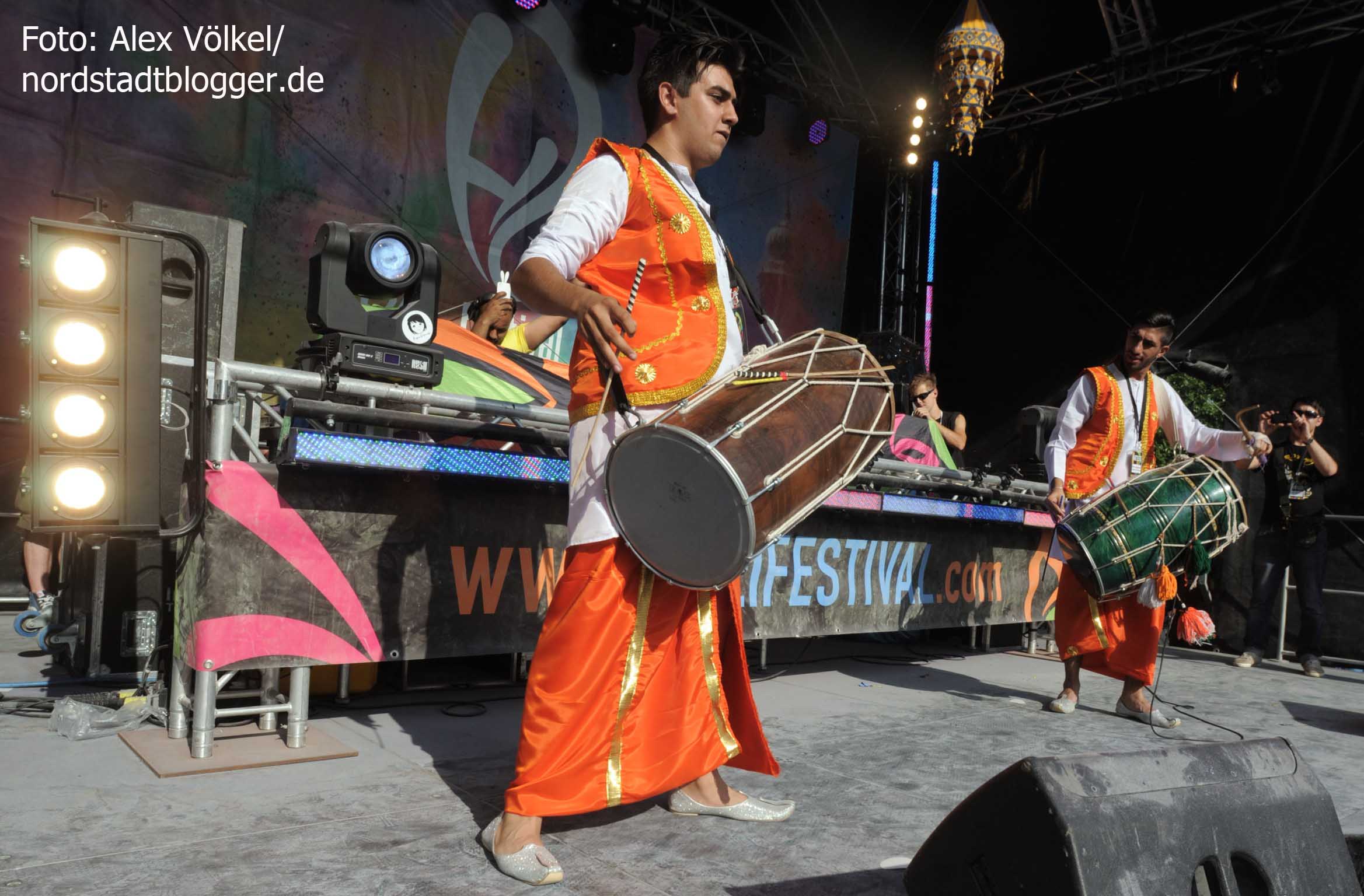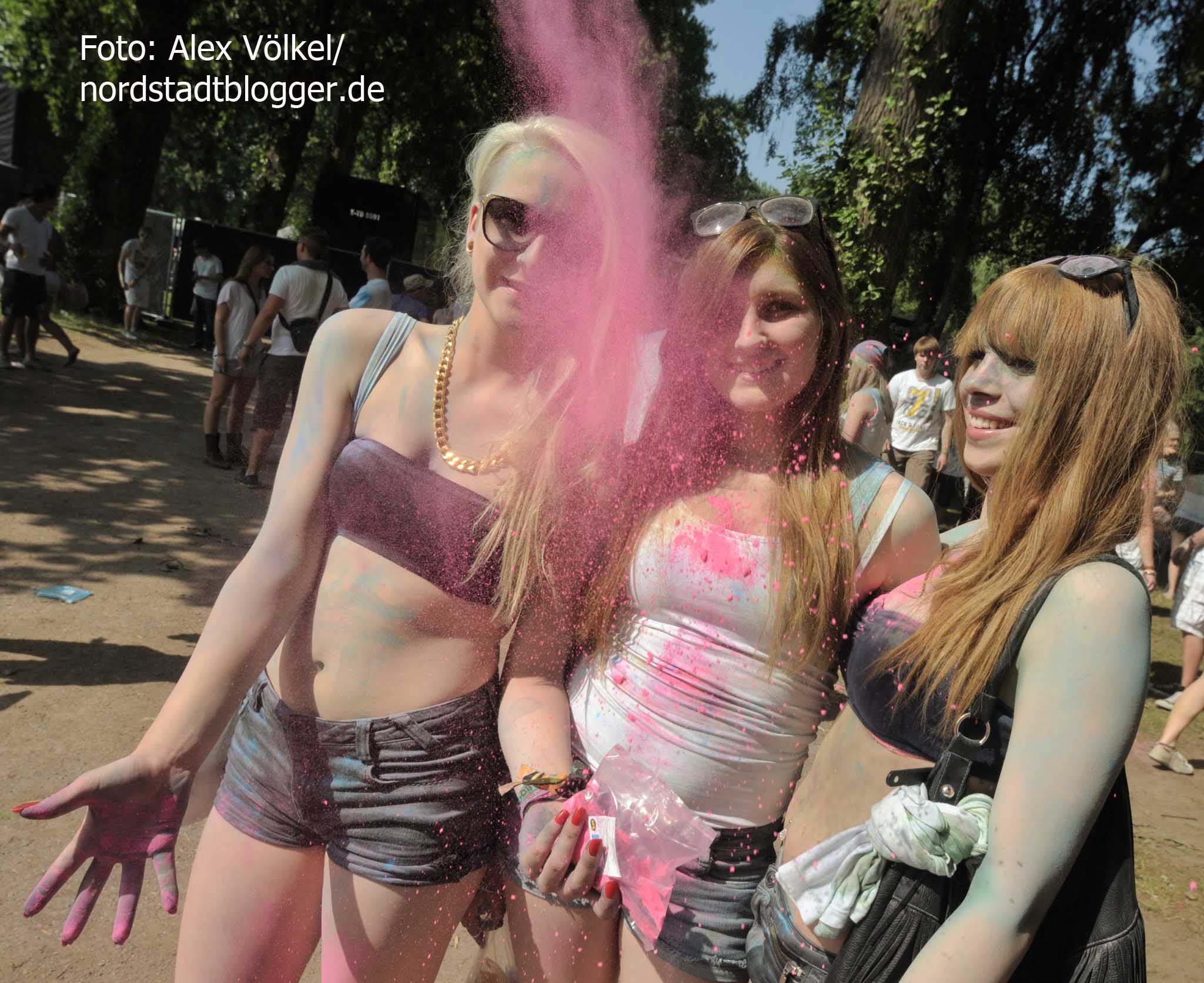 NSB-Fredenbaumpark - Festival of Colours (11)In Indien wird mit dem Farbenfest Jahr für Jahr der Frühling begrüßt. Die Menschen treffen sich, sie feiern, sie tanzen und werfen bunte Farben in den Himmel. Eine echte Pracht, die auch dafür sorgt, dass alle am Ende gleich aussehen und Alters- sowie Kastenunterschiede verschwinden. „Holi ist in Indien nicht nur ein Freudenfest. Es geht dabei auch um kulturelle Vielfalt, Toleranz und Respekt“, erklärt Organisator Max Riedel. Diese Idee haben die Veranstalter adaptiert und in ein musikalisches Festivalkonzept gegossen. Neben indischen Klängen waren vor allem moderne Sounds zu hören. Dafür zeichneten unter anderem Moguai und Aka Aka feat. Thalstroem verantwortlich. Für die indischeren Einflüsse sorgte das „Bombay Boogie Soundsystem“.