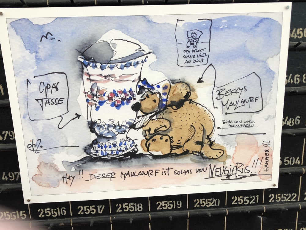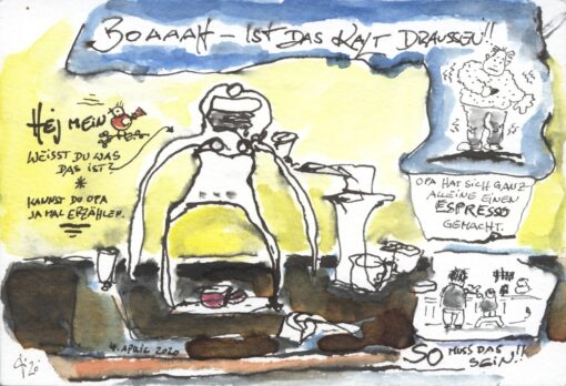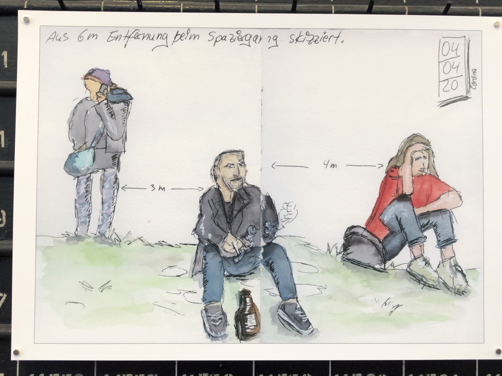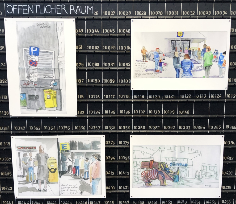Es wurden Szenen gezeichnet, wie die vielen Instagram-Livestreams, in denen Musiker*innen ein Konzert spielten, oder Warteschlangen vor Supermärkten. Aber auch persönliche Motive sind Teil der Ausstellung. Guido Wessel, Urban Sketcher Dortmund, zeichnete seinem Enkel einige Postkarten. Mit Erklärungen, Witzen oder gar Espresso, um der Zeichnung eine weitere Ebene (Geruch) zu verleihen, sind diese ausgestattet.