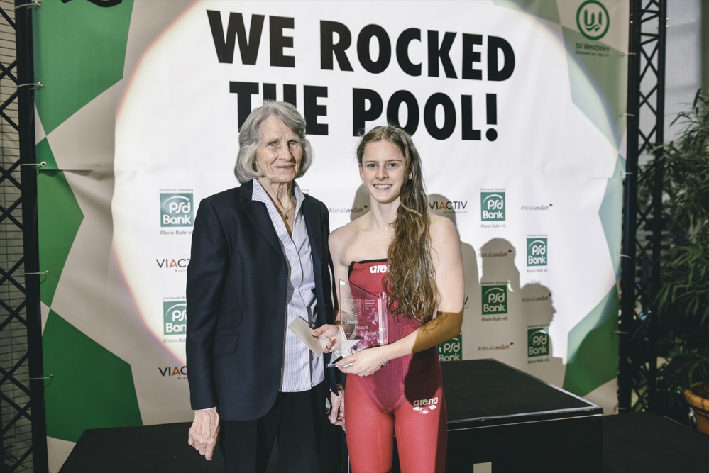 Die besten Brust-Spezialisten schwammen in 50, 100 und 200 Meter um den Ursula-Happe-Pokal, den die 90-Jährige Olympiasiegerin von 1956 am Sonntag persönlich überreichte. Siegerin Michelle Pschuk von der SG Ruhr behauptete, die Ehrung sei für sie schöner als bei Deutschen Meisterschaften.