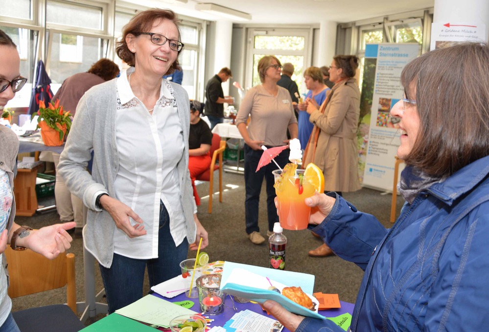 Trotzdem waren alle Gäste eingeladen, die Angebote der Diakonie kennenzulernen: Vom Glücksrad des Fachbereichs Psychiatrie und Behindertenarbeit, über Dosenwerfen mit Rauschbrille der Fachstelle Sucht, einer Tee-Lounge der Migrationsarbeit, bunten Fingerfood-Angeboten der Diakonischen Pflege, einer Fotoaktion des Diakoniezentrums Sternstraße, alkoholfreie Cocktails aus Lünen, bis zu einer Siebdruck-Vorführung. Ebenfalls boten viele Arbeitsgebiete von den Klienten in der Ergotherapie hergestellte Produkte an.