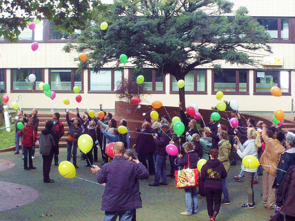 Anschließend berichtete ZBS-Leiter Thomas Bohne aus seinem Arbeitsfeld und begleitete anschließend sein Mitarbeiterteam an der Gitarre. Dieses hatte einige Lieder vorbereitet, in die die Gäste einstimmten. Höhepunkt des Festes, das den Titel „Wo ist für mich zu Hause?“ trug, war eine bunte Ballonaktion: Auf Karten trugen die Besucher ihre ganz persönlichen Wünsche für die Zukunft ein und ließen diese zusammen im Innenhof steigen.