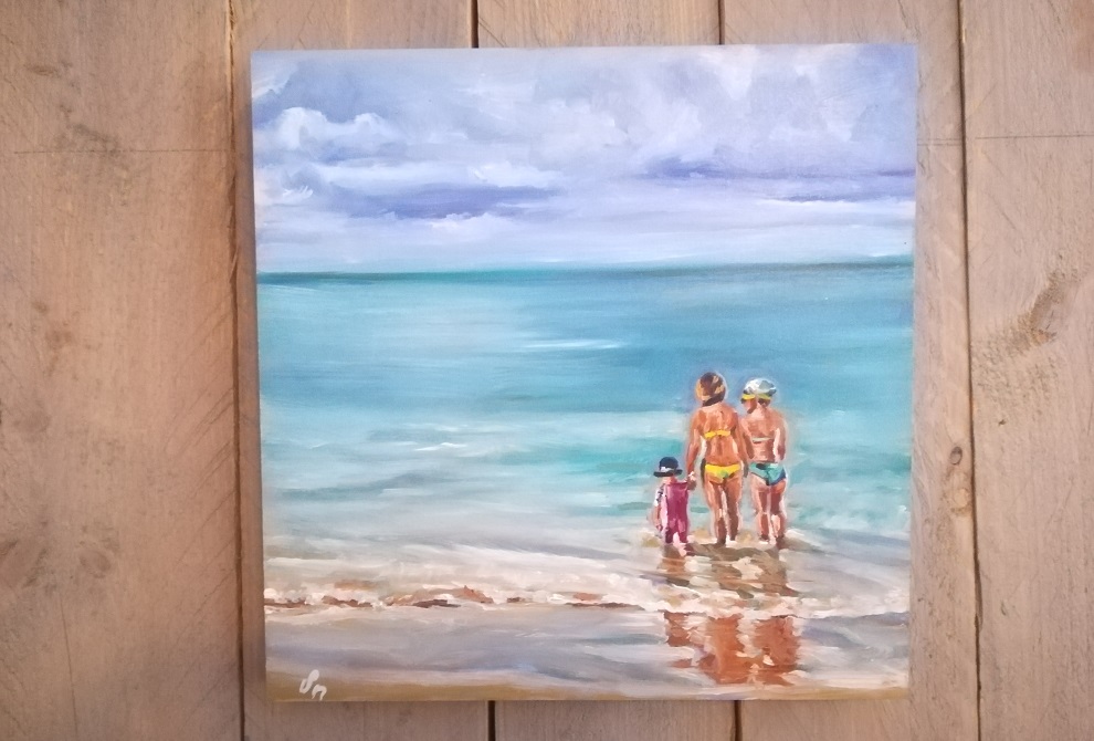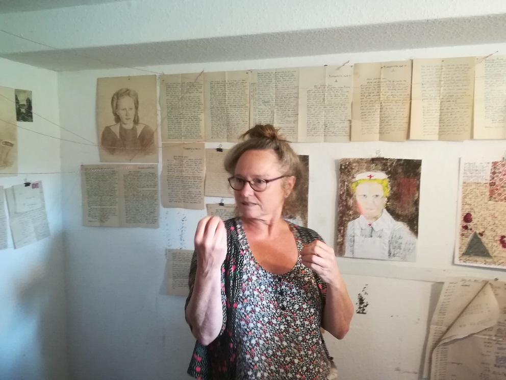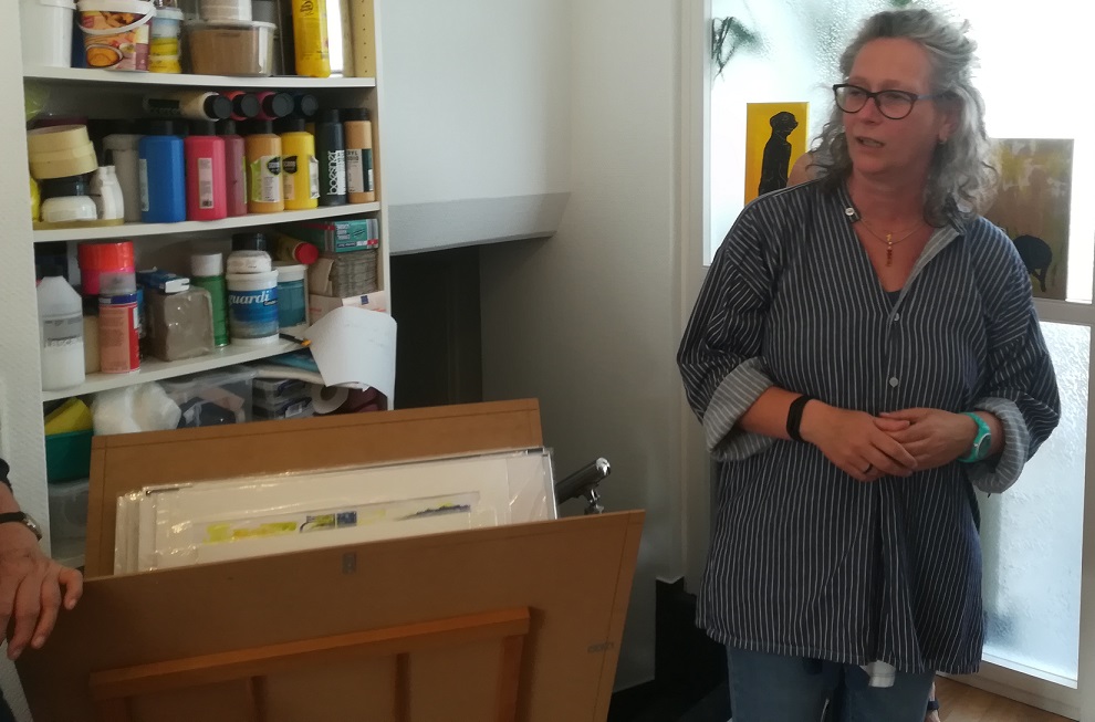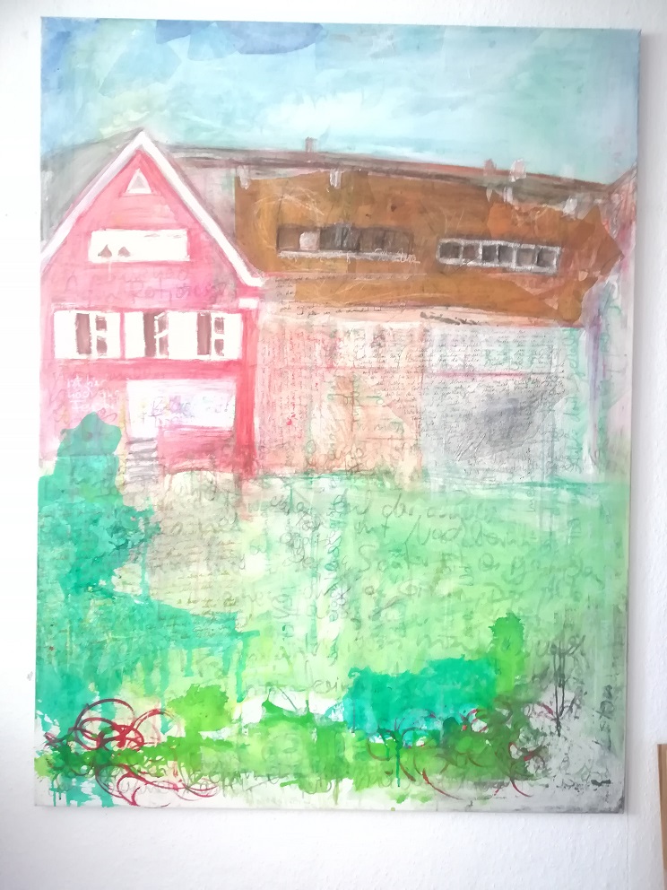 Die Tour durch die vielfältige Kunstszene der Stadt führte zunächst in den Dortmunder Süden zu Susanne Grytzka. Grytzka fügt in ihre Bilder immer auch Texte eigener Gedanken oder Zitate aus Briefen ihrer Eltern und von anderen Personen  ein.