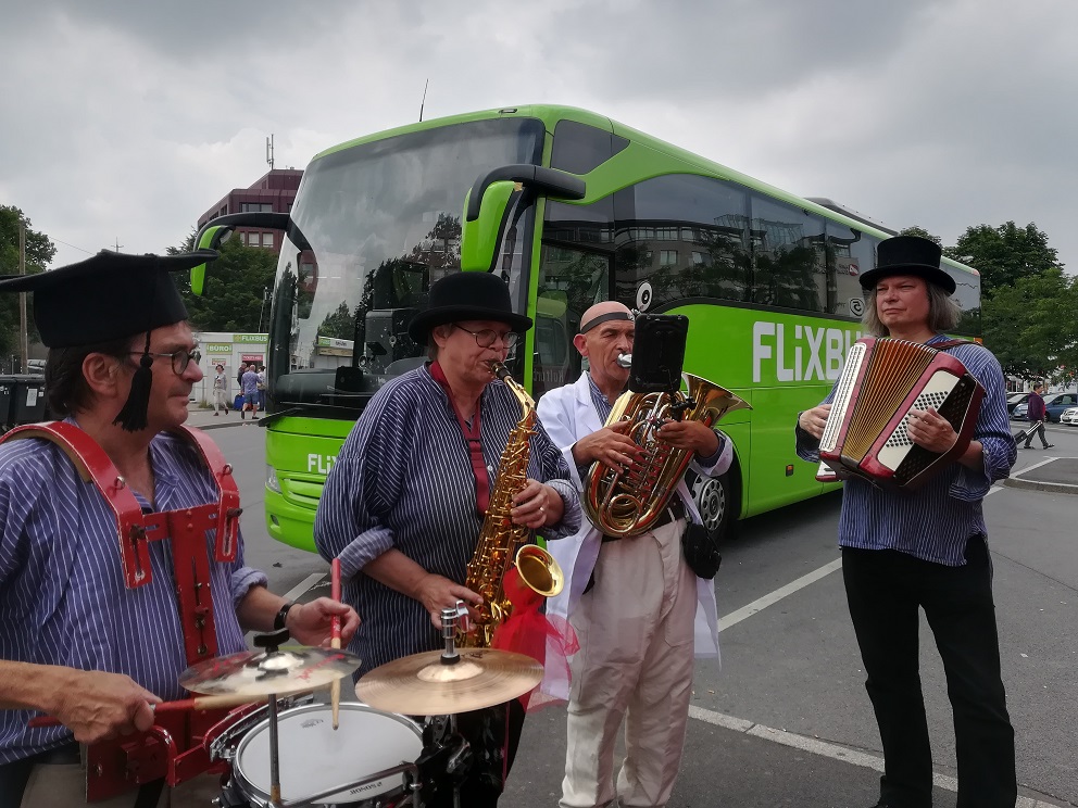 Am Sonntagmittag, bei strahlendem Sonnenschein, startete die unterhaltsam, amüsante und höchst informative Galerie-Tour um 13.45 Uhr am Hauptbahnhof von Dortmund. Die erwartungsvollen Mitreisenden wurden von Musik und den Initiatoren in ihren Kostümen vom DADA-DO-Team in Empfang genommen. Durch einen Sekt zur Begrüßung beschwingt, startet die Tour zu den unterschiedlichen Galerien und KünstlerInnen.
