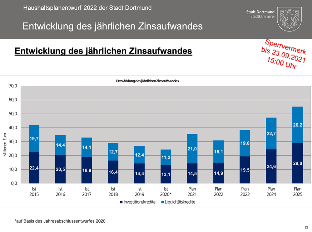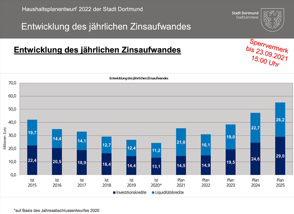 Ebenfalls im Haushalt mit inbegriffen: ein Modell steigender Zinslasten, also ein sehr konservativer Ansatz, wie Stüdemann betont. Dadurch sei man auf die Eventualität eines sog. Zinsprunges vorbereitet. Gegenwärtig zahlt die Stadt jährlich ca. 30 Millionen Euro Zinsen für Liquiditäts- und Investitionskredite; der Kämmerer rechnet aber bis 2025 mit einem Anstieg auf 60 Millionen. Werden es weniger, umso besser: dann werden zusätzliche Mittel freigesetzt.