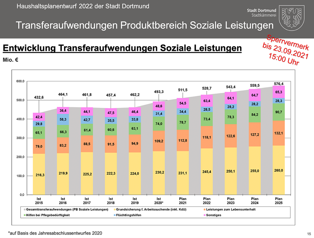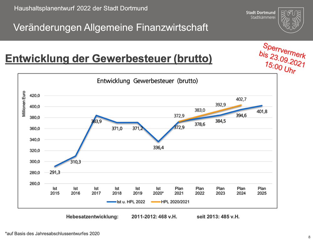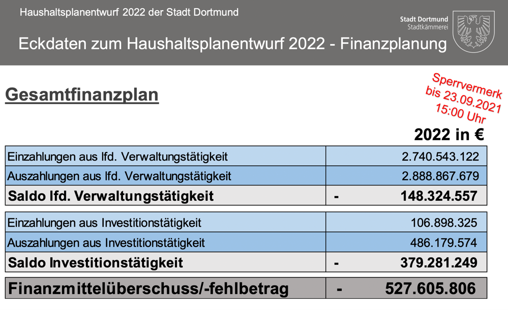 Auch muss Dortmund weiterhin kein Haushaltssicherungskonzept in Arnsberg vorlegen, da der geplante Jahresfehlbedarf bis 2024 unter der 5-Prozent-Marke nach § 76 der Gemeindeordnung NRW liegt. Insofern bleibt die Stadt handlungsfähig. Kann quasi für sich selbst entscheiden, was sie tut, wo sie Prioritäten setzt, ohne dass jemand aus dem Sauerland dazwischen grätscht.