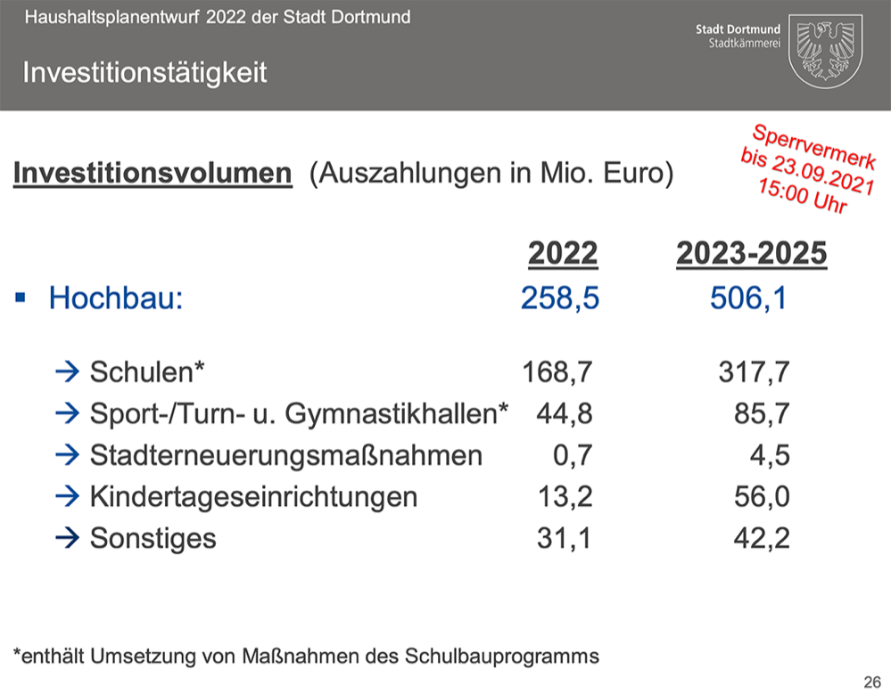 Nach der nun offiziell vollzogenen Einbringung in den Rat der Stadt Dortmund wird der Haushaltsplanentwurf in den Bezirksvertretungen und Fachausschüssen beraten und mit etwaigen/allfälligen Veränderungen dem Rat im Dezember zur abschließenden Beschlussfassung vorgelegt werden.
